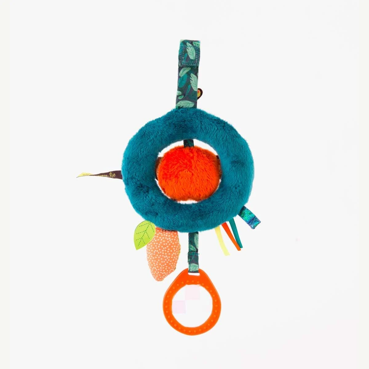 L’anneau d’activités aux motifs feuilles comporte un prisme avec deux perles le long de son cordon, des petits gris-gris et feuilles pour amuser bébé. Au centre, un petit poussin au pelage orange déjanté est bien installé, comme sur une balançoire.