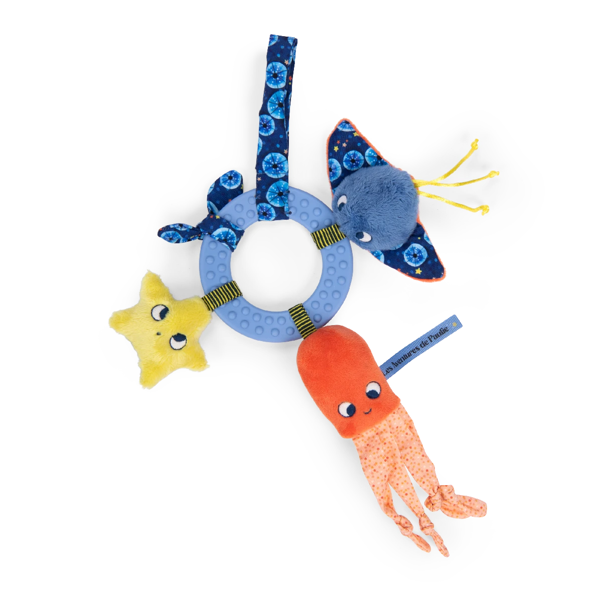 Anneau d’activités à manipuler ou à suspendre. Il est composé de trois petits personnages marins aux matières et sons différents, d’une nouette décorative et d’un grand anneau de dentition texturé que bébé pourra mâchouiller..