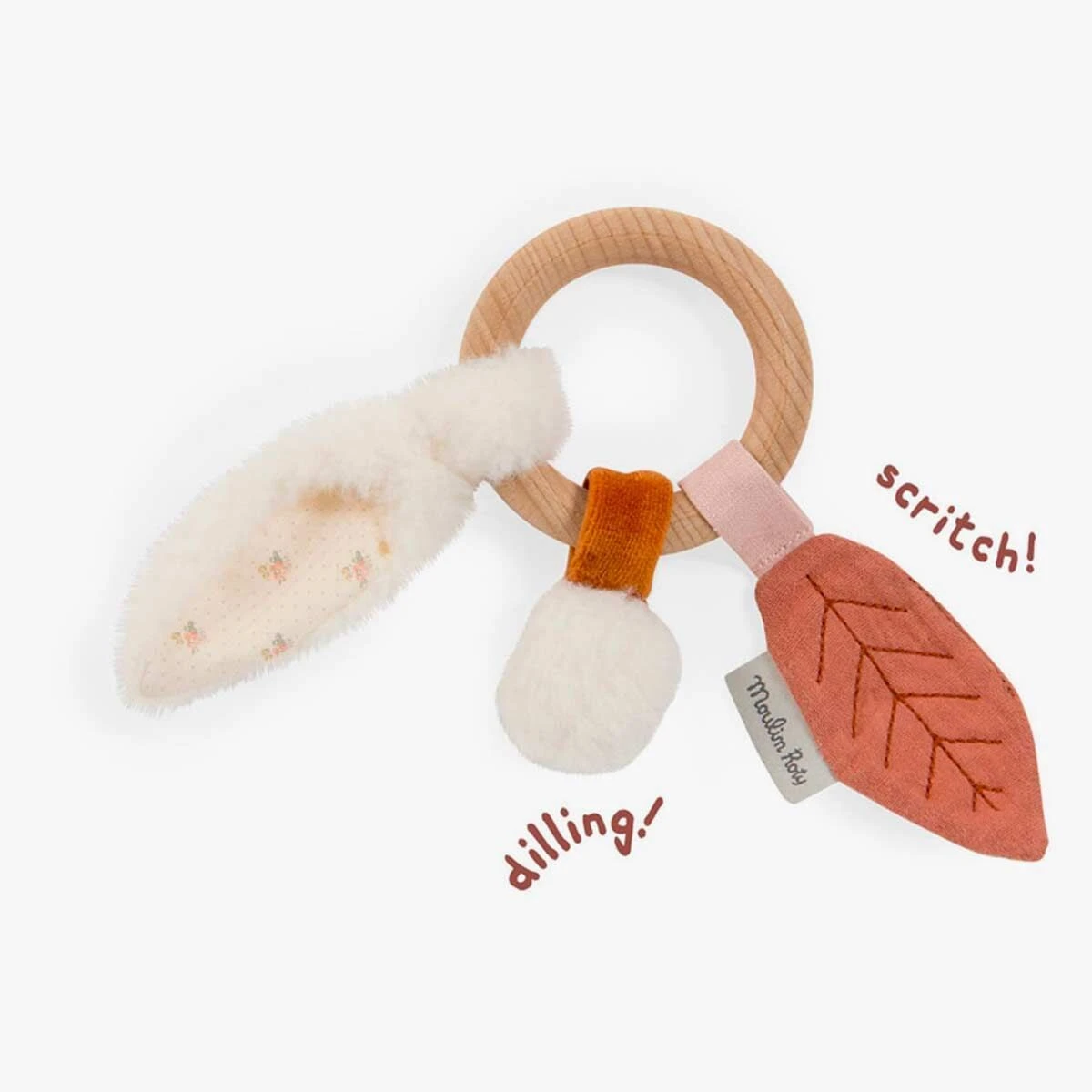 Anneau rond en bois naturel, sur lequel sont cousus une feuille, une oreille et une queue de lapin en fourrure avec quelques surprises… Du papier bruissant et des grelots pour Ă©veiller bĂ©bĂ© durant les balades d’automne !
