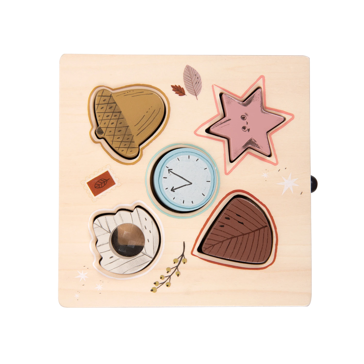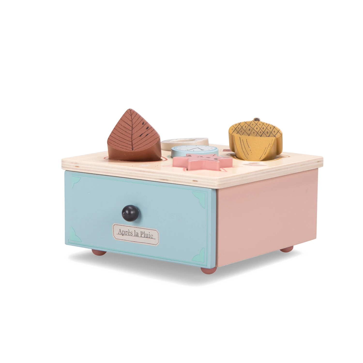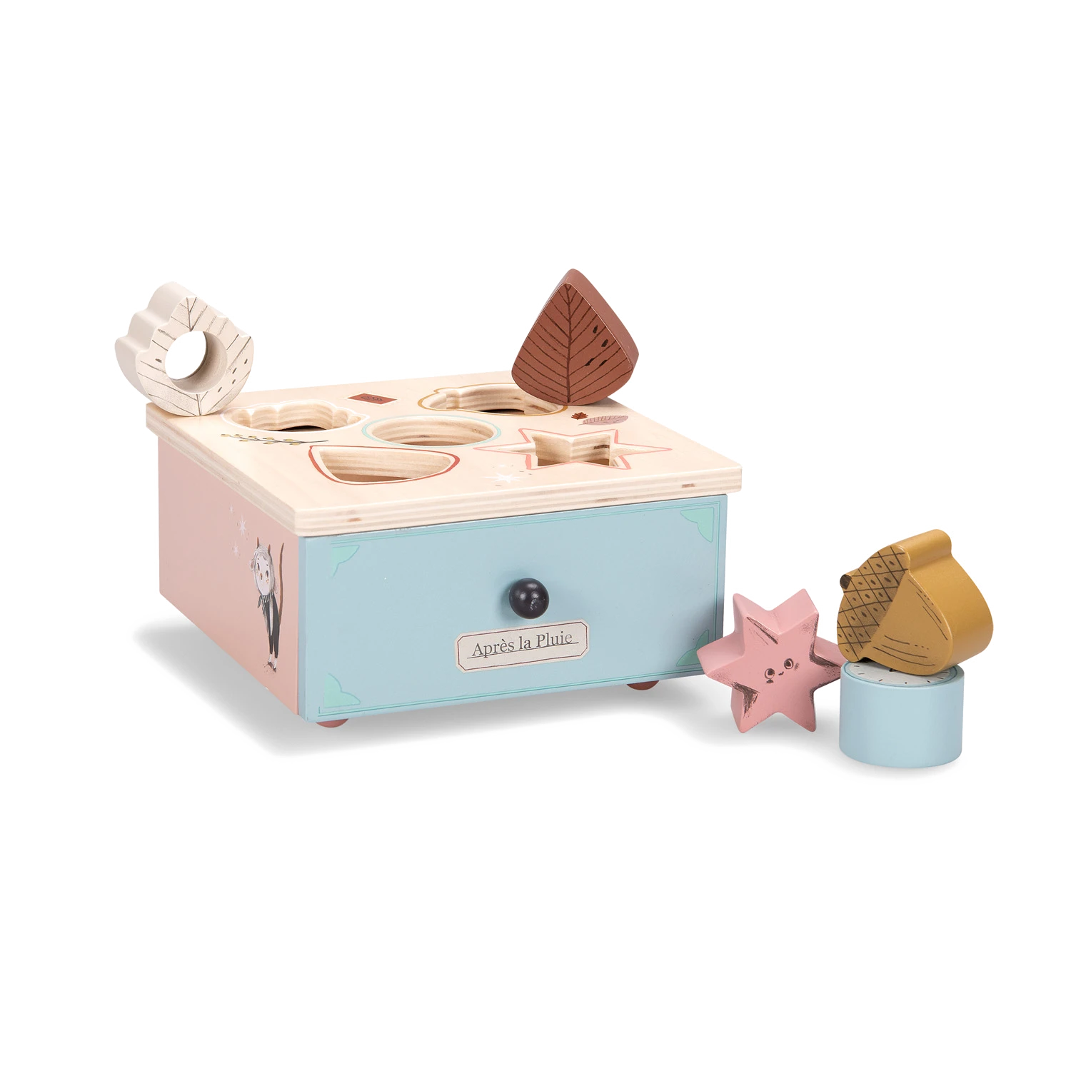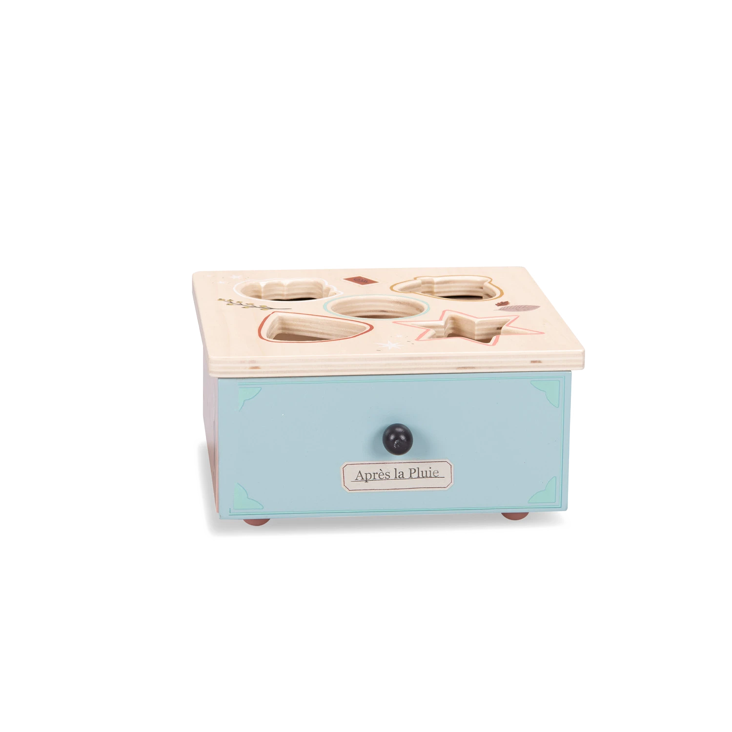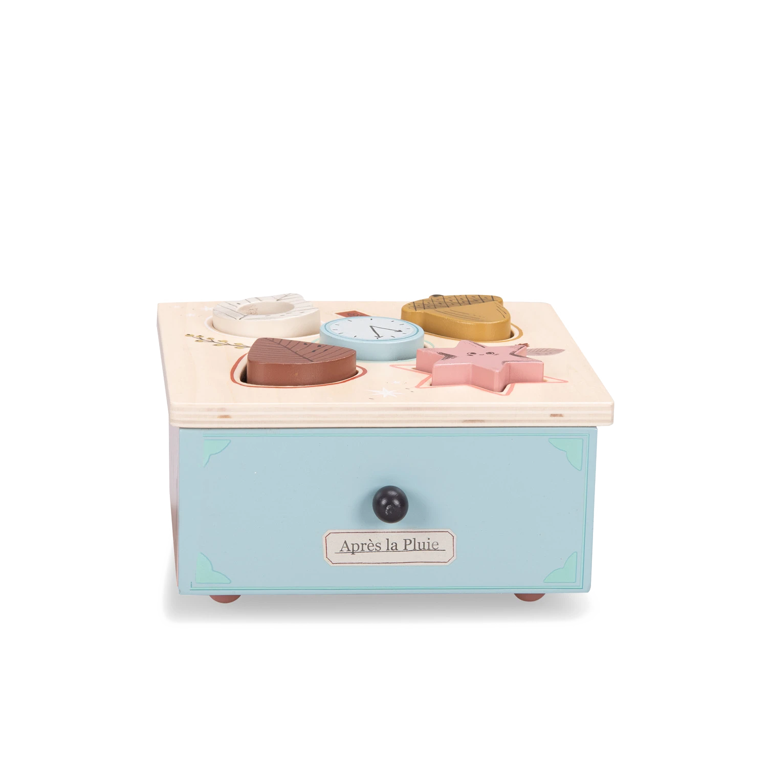 Boite en bois joliment illustrée pour apprendre les formes et les couleurs. Contient 5 formes à manipuler, conçues pour les petites mains. Autour de chaque trou, se trouve la couleur de la forme à encastrer pour guider bébé.