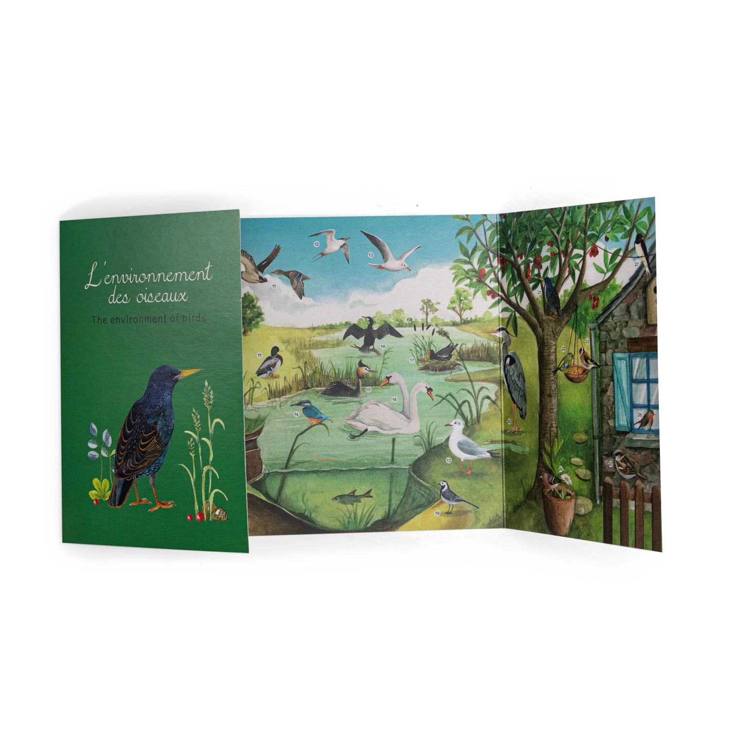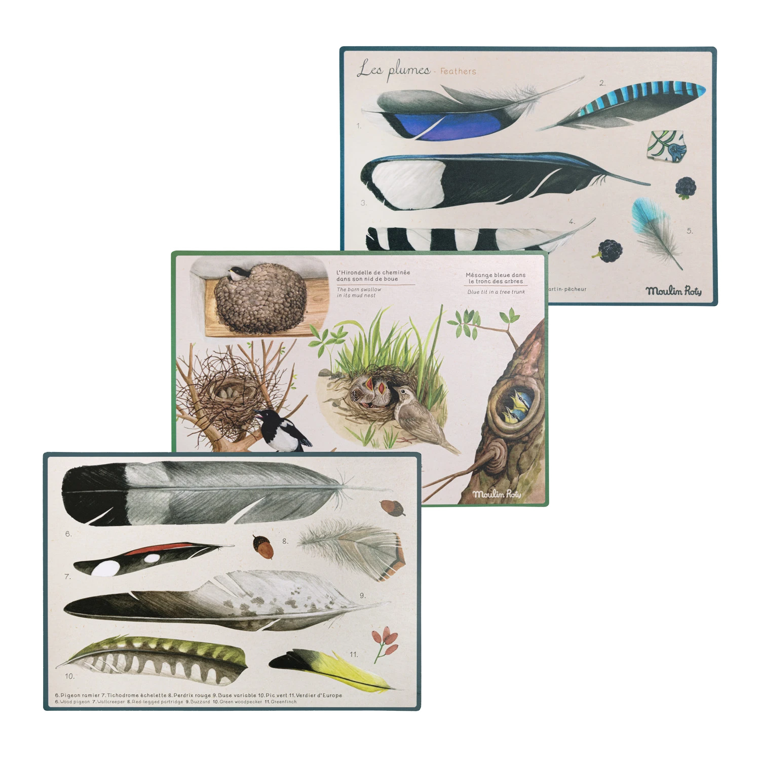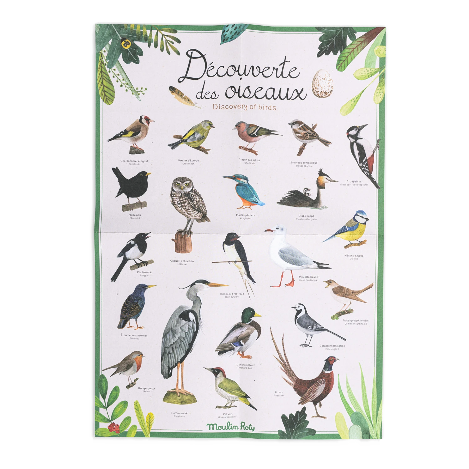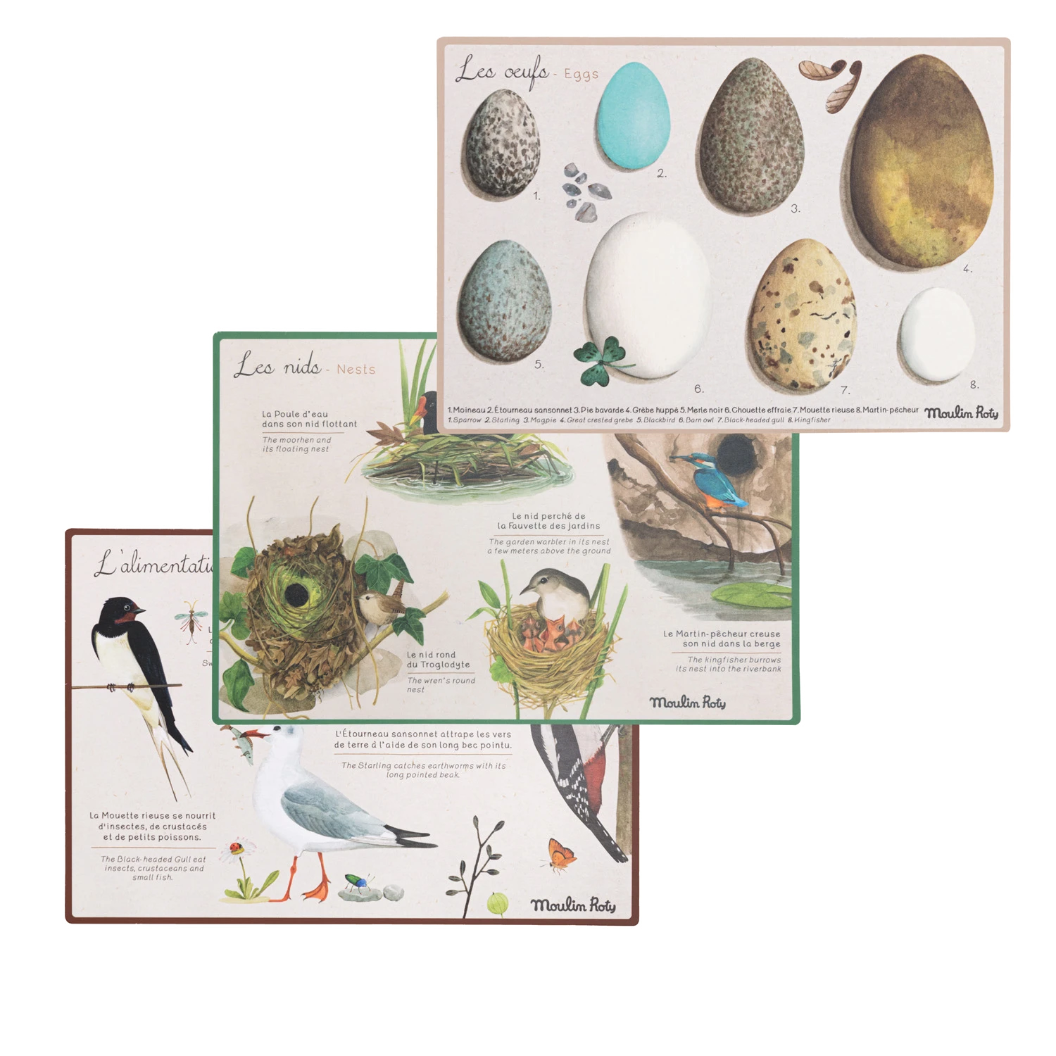 | Contenu du produit | 4 cartes (plumes, œufs, nids, alimentation), 16 portraits d'oiseaux, 1 appeau pour imiter les oiseaux, 1 carte nocturne phosphorescente, 1 cahier d'activités, 1 affiche, 1 notice, 1 dépliant sur l'environnement des oiseaux |