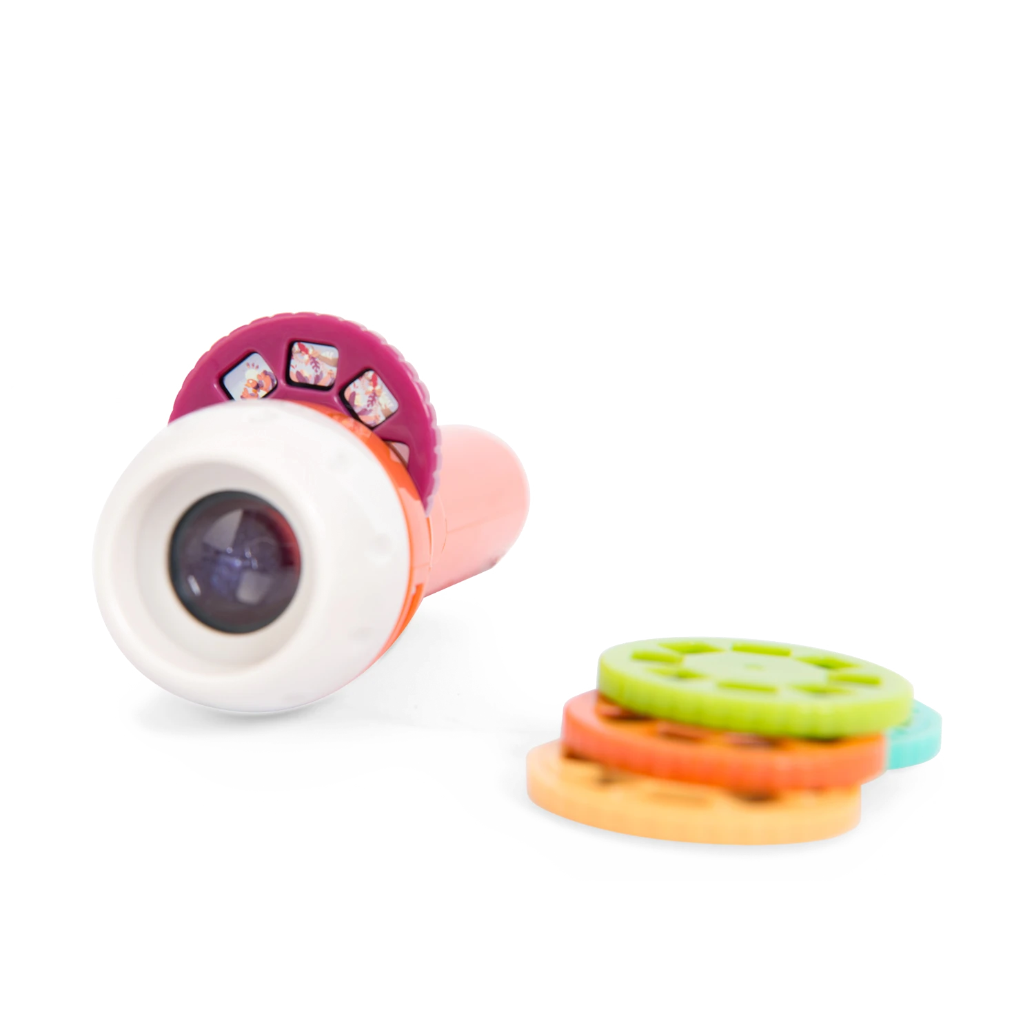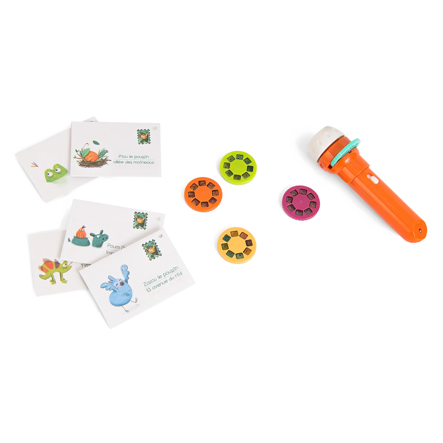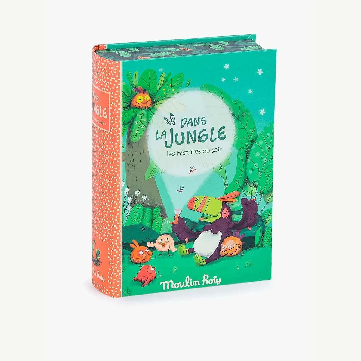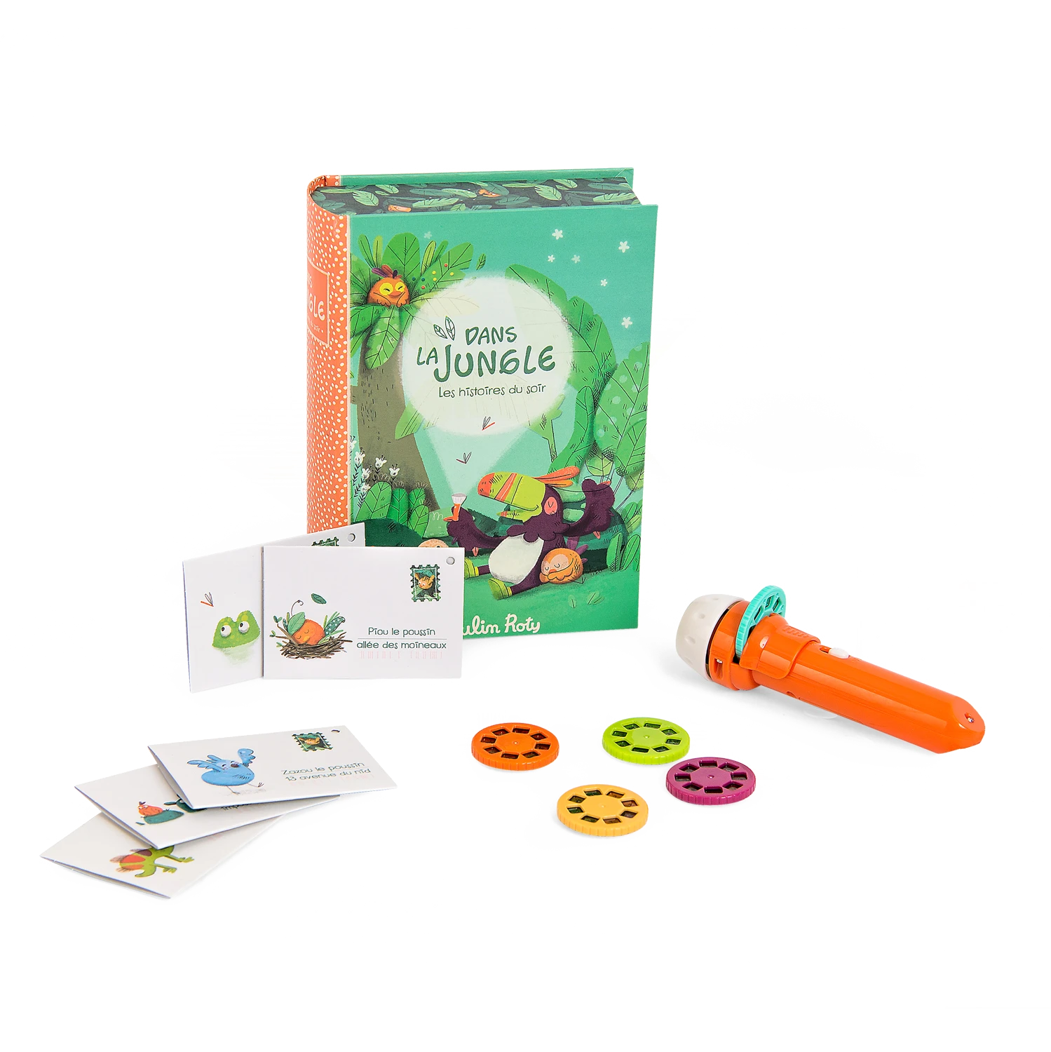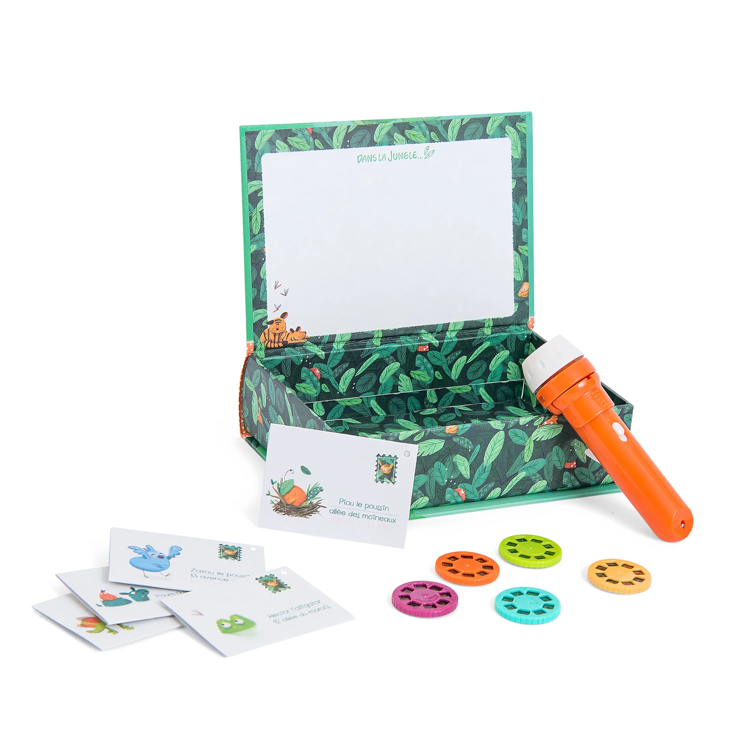 Conçu comme un livre, ce ravissant coffret tropical contient une lampe à projeter avec 5 disques à histoires et de précieux cartons d’invitation aux spectacles, en forme de mini enveloppes avec des messages secrets.