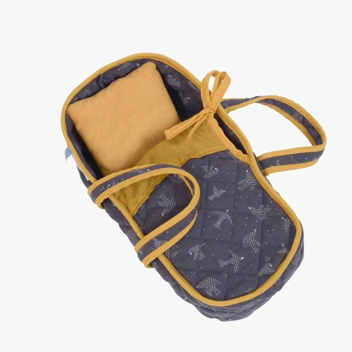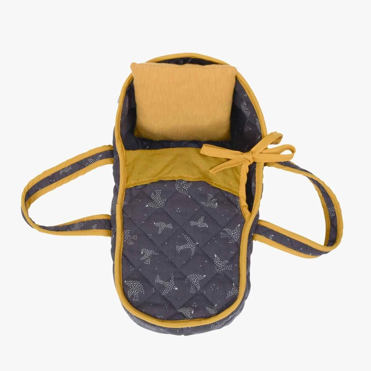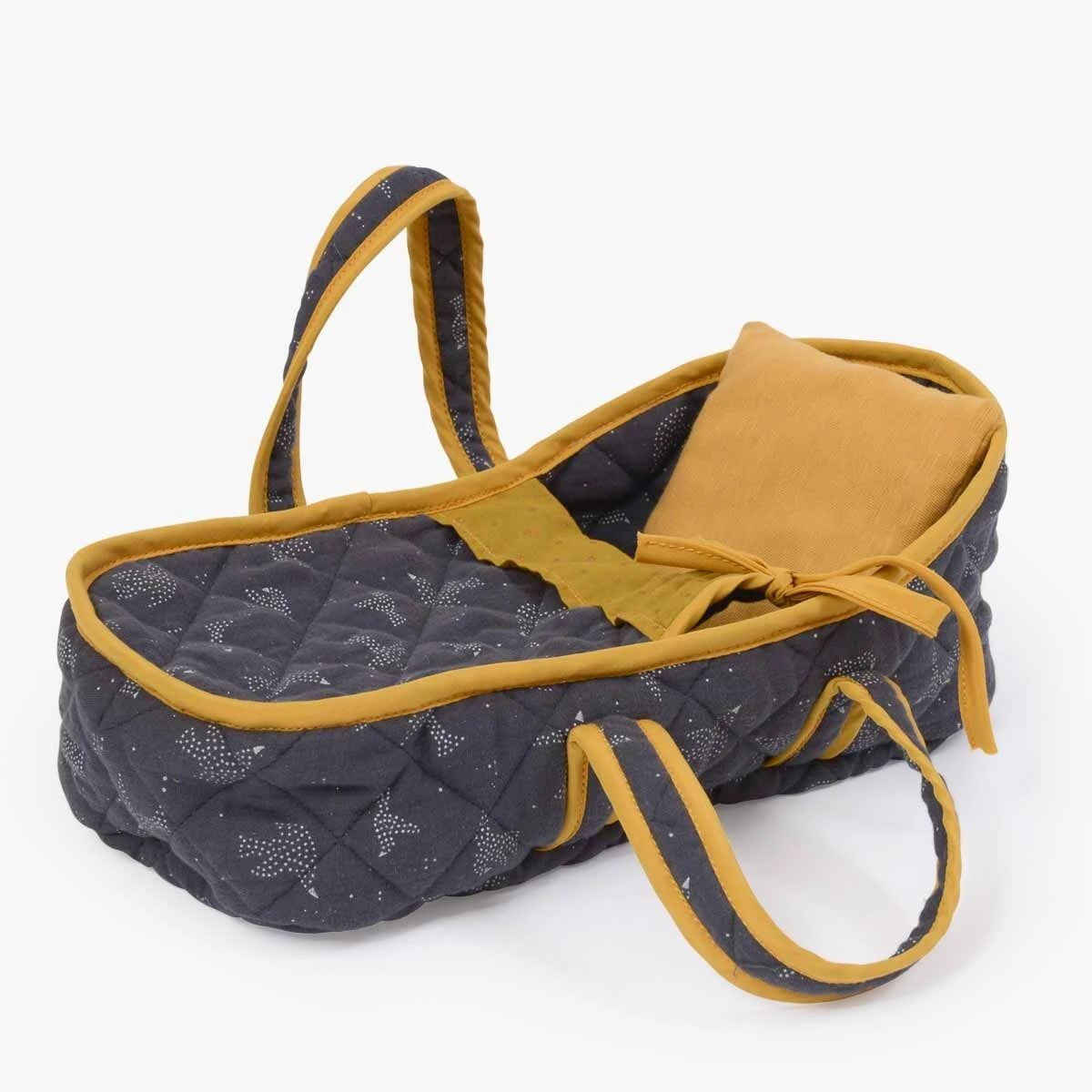 Couffin gris anthracite en tissu lange matelassé pour promener et endormir bébé. Il se transporte grâce à deux jolies anses avec biais jaune moutarde, et comprend un oreiller assorti.
