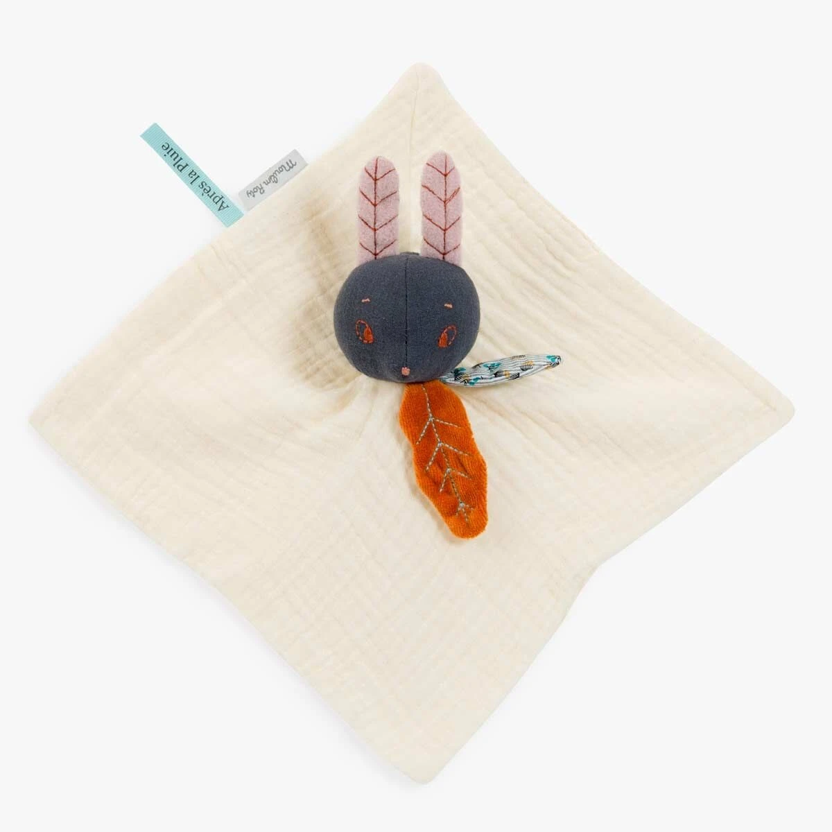 Doudou Lune en lange de coton biologique. Il porte à son cou deux feuilles d’automne, son minois est brodé de fil cuivré et ses oreilles sont en polaire toute douce pour se glisser auprès de bébé. Peut être brodé au prénom de l’enfant.