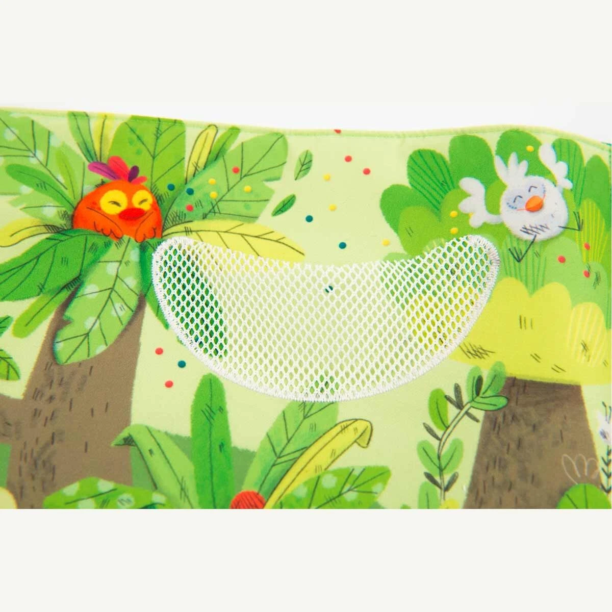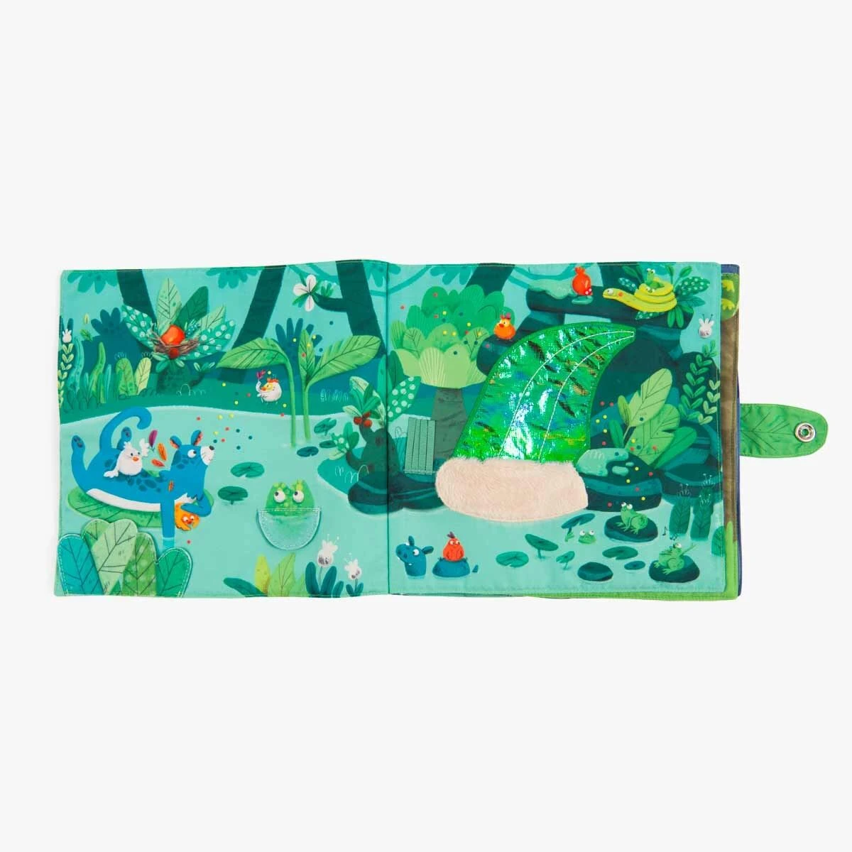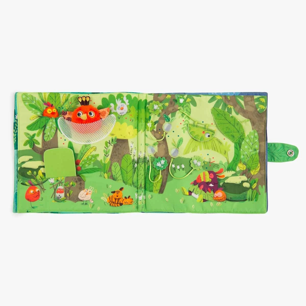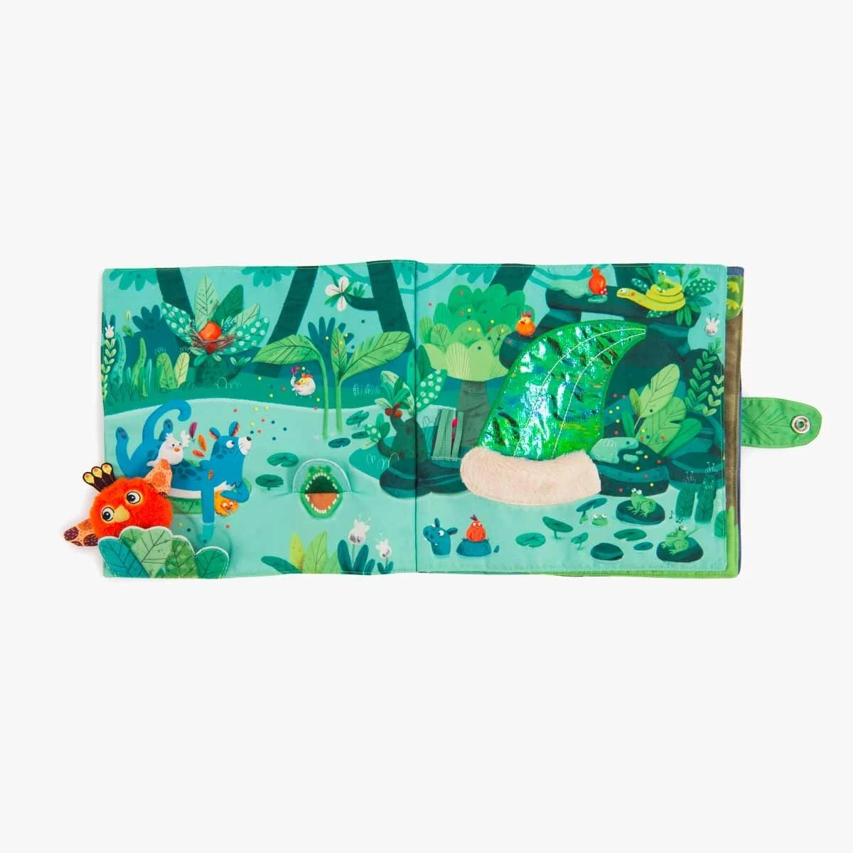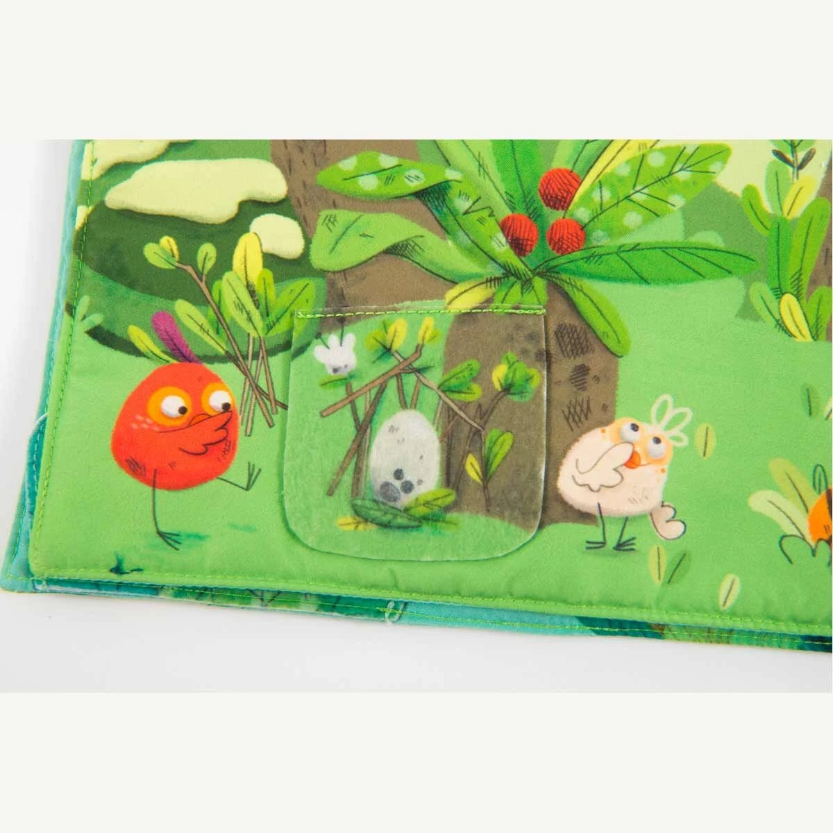 Livre en tissu 6 pages avec un petit poussin chantant à accompagner dans toutes les activités de la jungle ! Jeux de matières à découvrir et éléments à scratcher, il est idéal pour développer la motricité fine !
