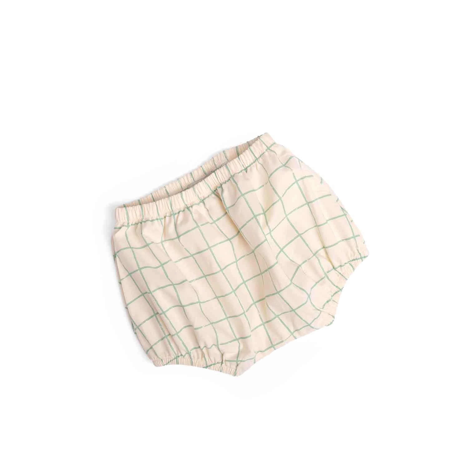 Bloomer en popeline de coton bio à carreaux vert menthe sur fond crème. Elastiqué à la ceinture et aux cuisses.