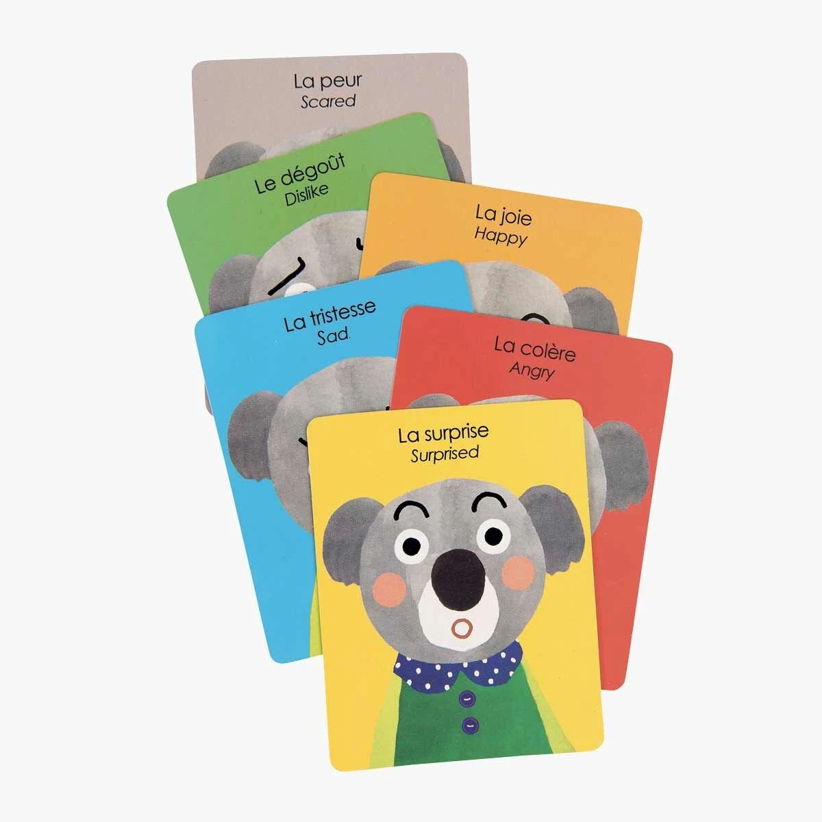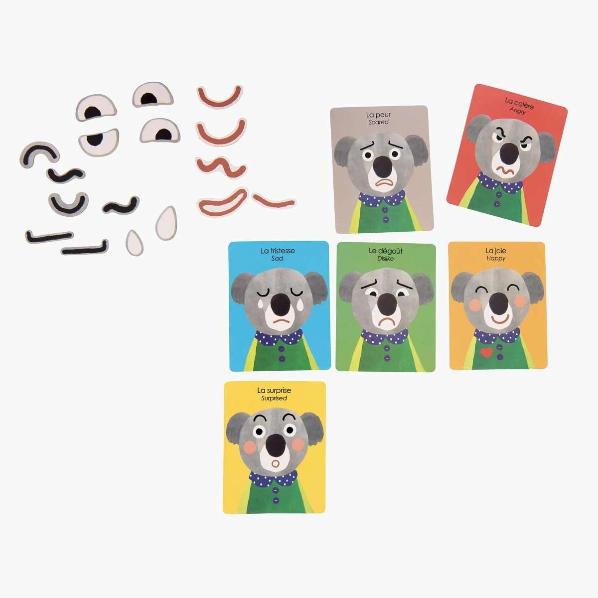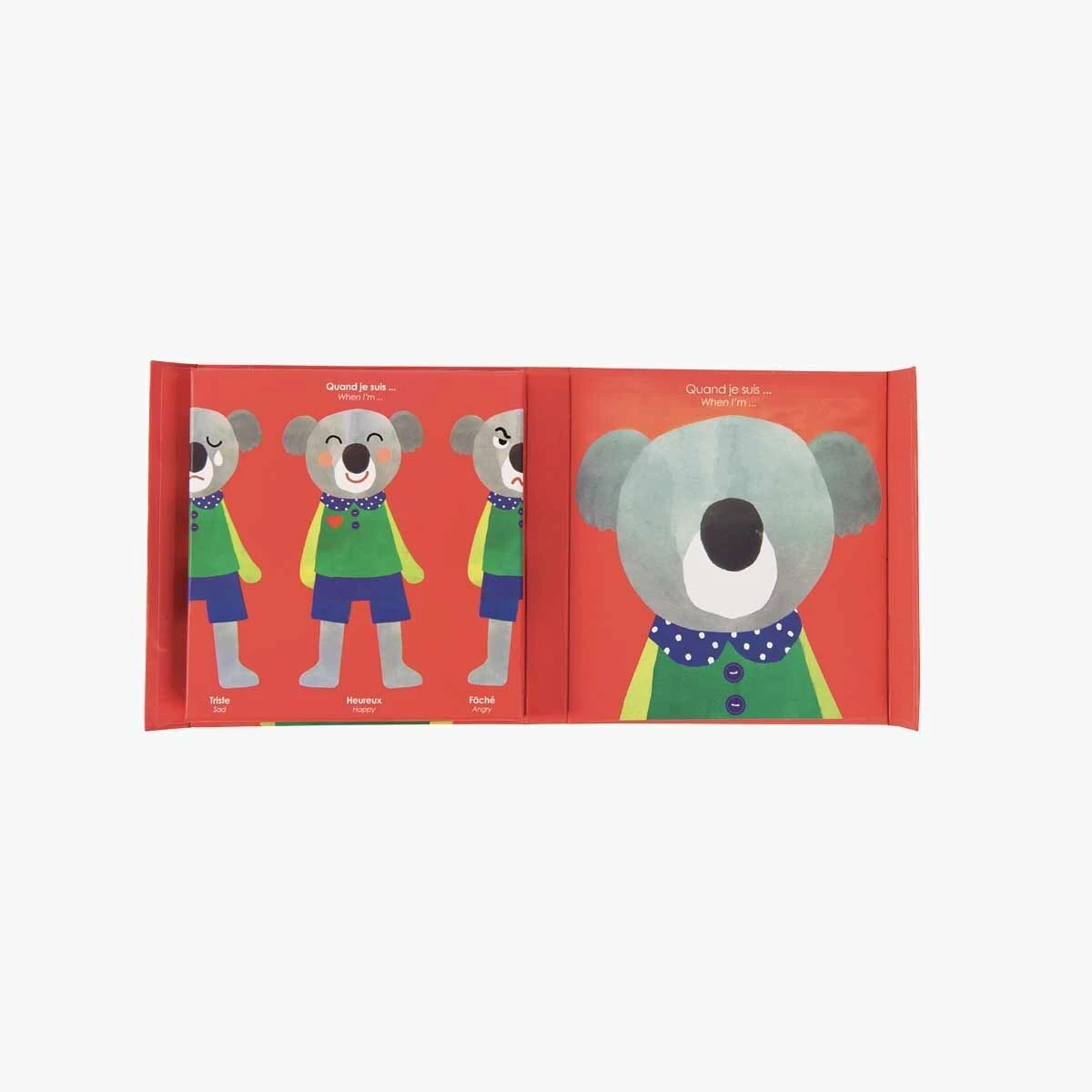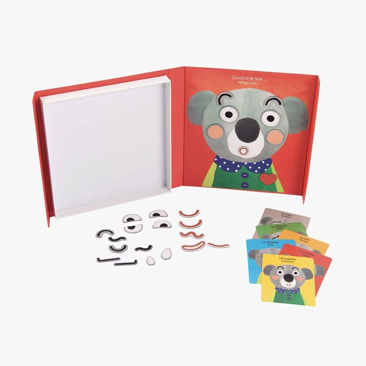 Illustrations rondes et colorées pour ce jeu 1er âge sous forme de livre-coffret aimanté. Sur un portrait de koala dessiné, on pose parmi les 25 magnets, yeux, bouche…à disposition, celles qui expriment l’expression de la carte piochée : la peur, la joie…