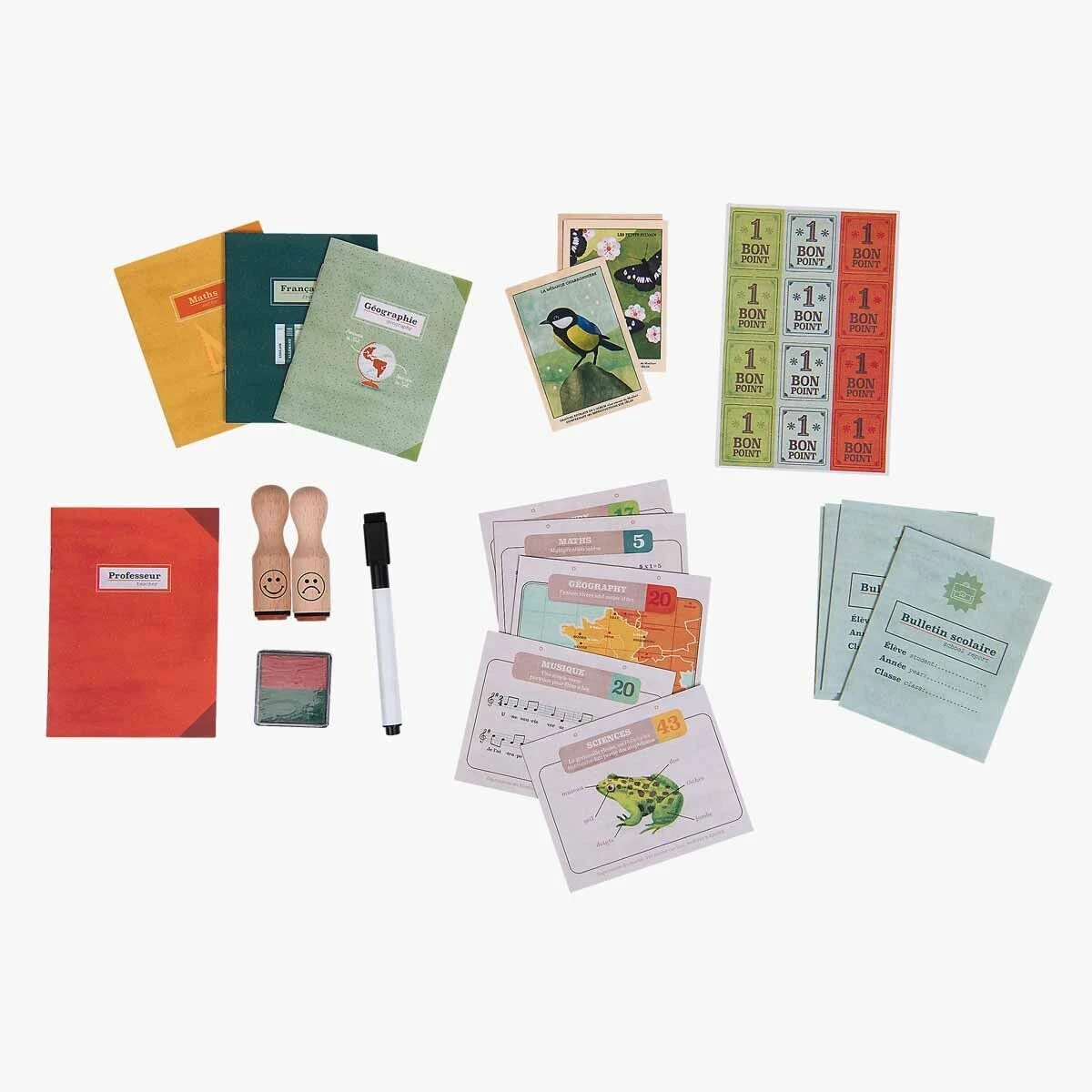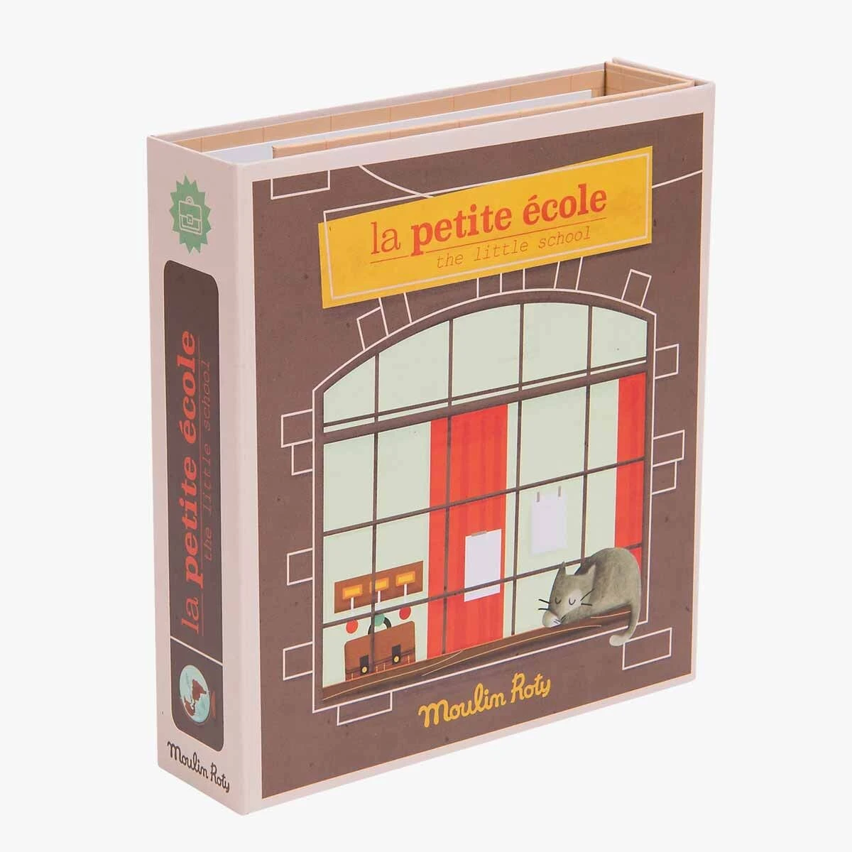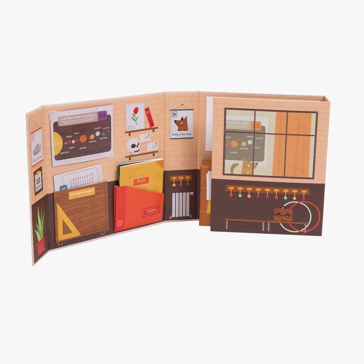 Coffret en carton « La petite école » avec 2 volets à déployer. Une fois le décor installé, la journée commence : bons points, leçons, cahiers… ainsi qu’un carnet à remplir, une règle, un crayon effaçable et 2 tampons pour jouer et imaginer son quotidien !
