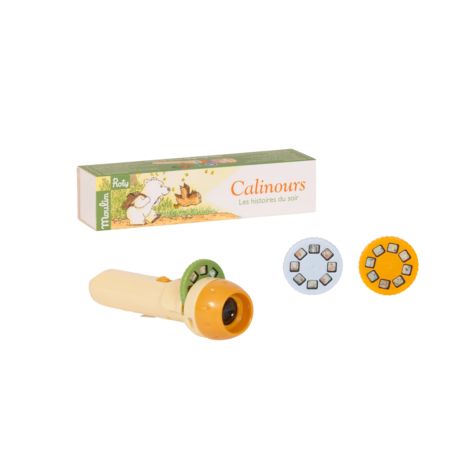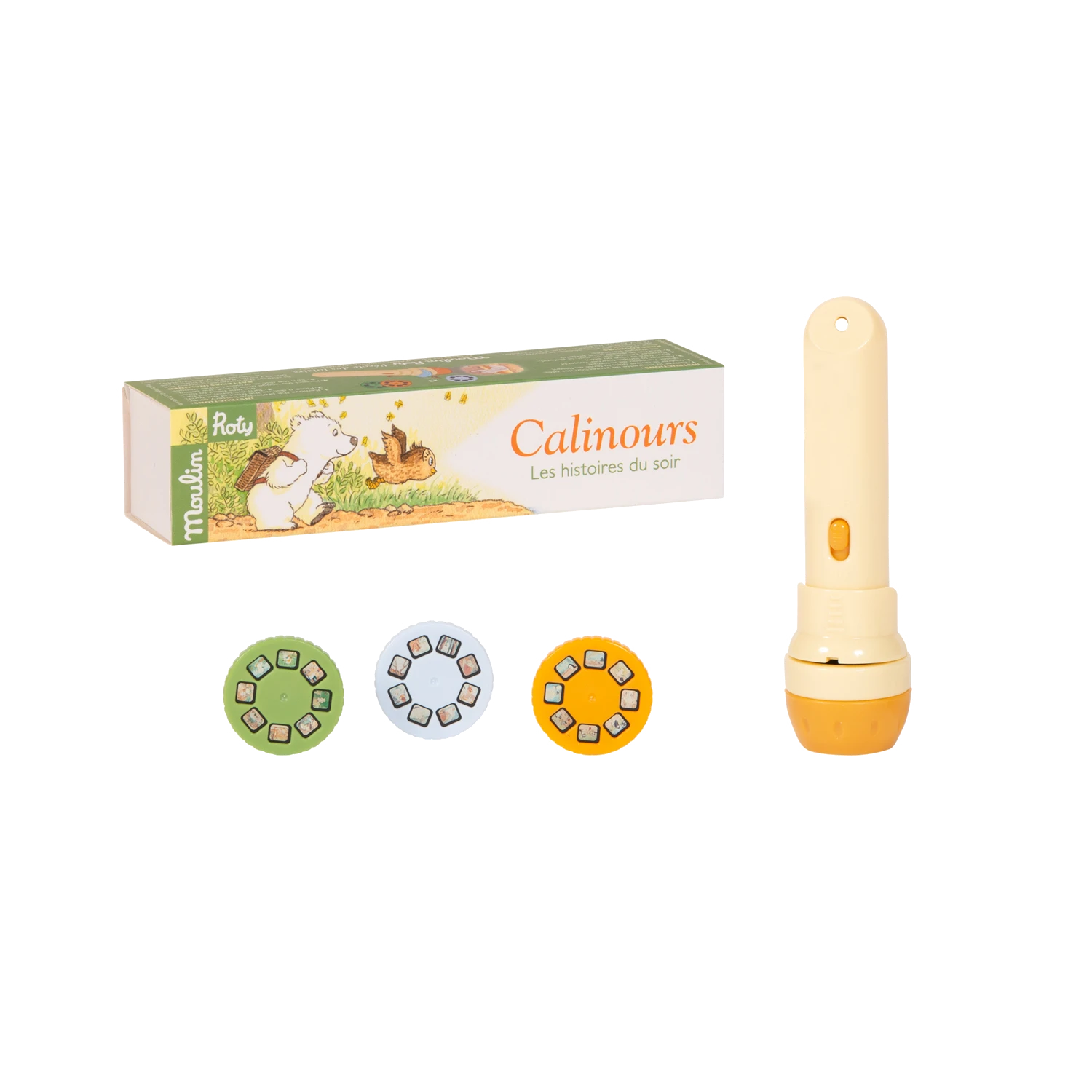Lampe torche de poche où chacun des 3 disques projetés sur le mur raconte les aventures de Calinours, l’ourson mignon, héros de l’école des loisirs. Pour endormir les tout-petits et développer leur imagination !