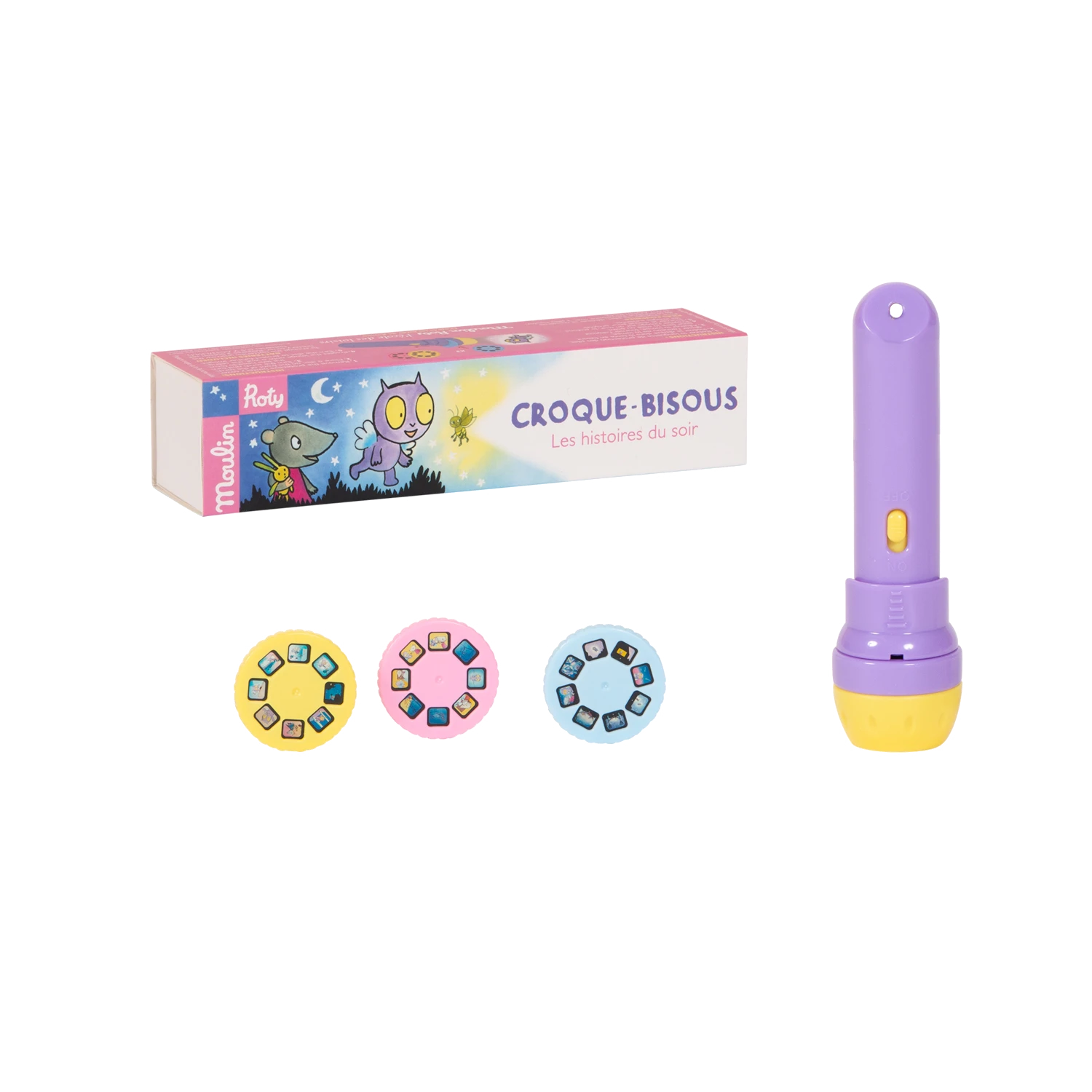 Lampe torche de poche où chacun des 3 disques projetés sur le mur raconte les aventures de Croque-Bisous, héros de l’école des loisirs. Pour endormir les tout-petits et développer leur imagination !