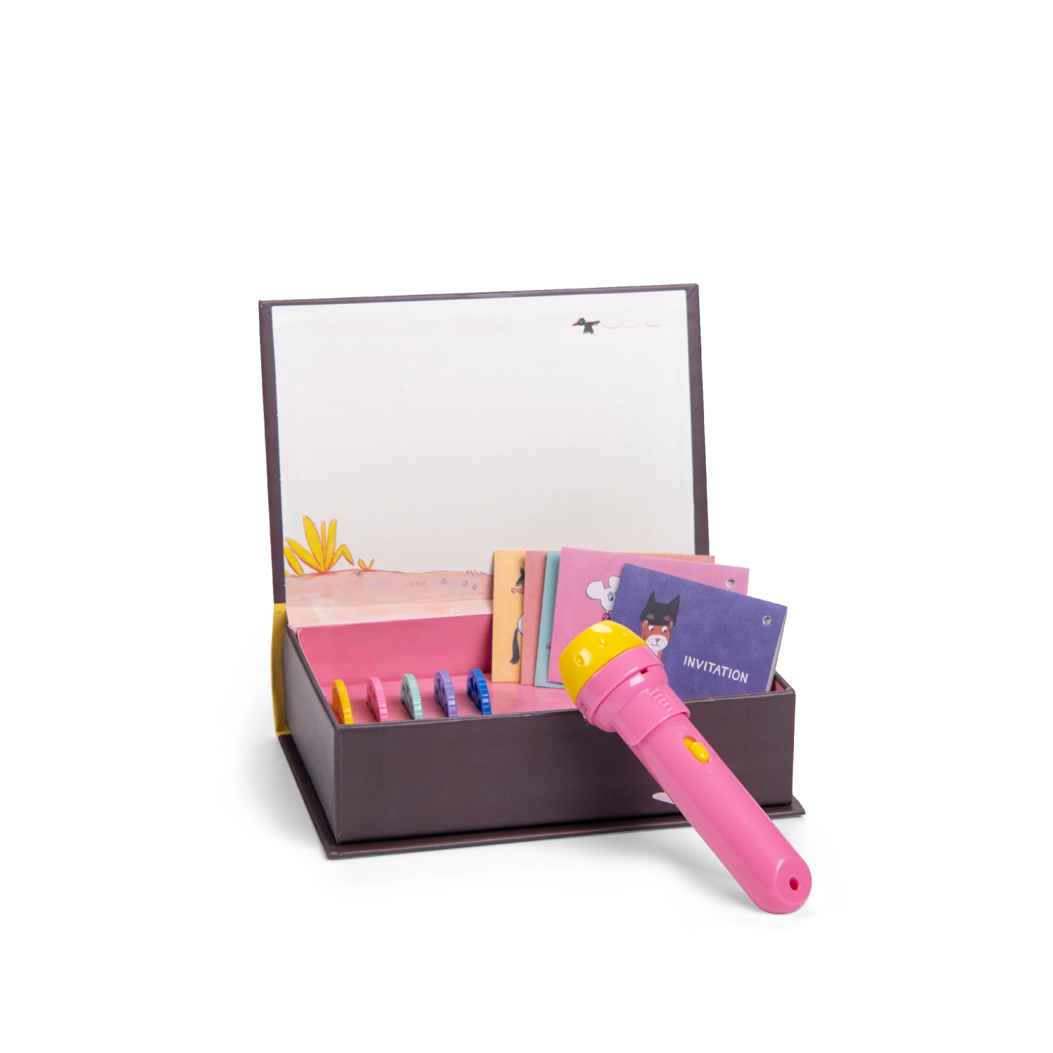Coffret illustré, conçu comme un livre magique avec une lampe à projeter, 5 disques et 5 invitations. Chaque disque, projeté dans le livre ou sur un mur, raconte une histoire de Billy le hamster et son ami Jean-Claude de l’école des loisirs.