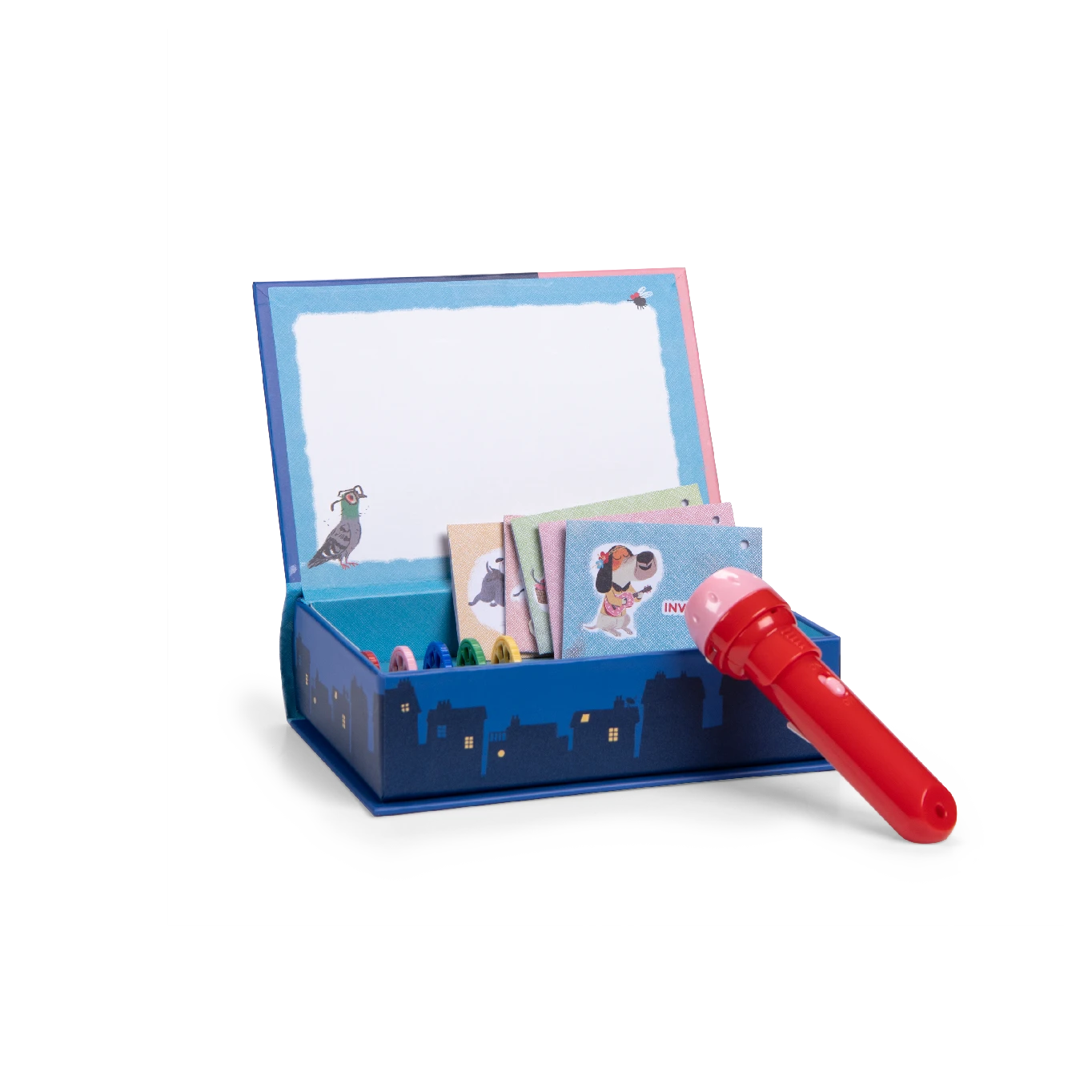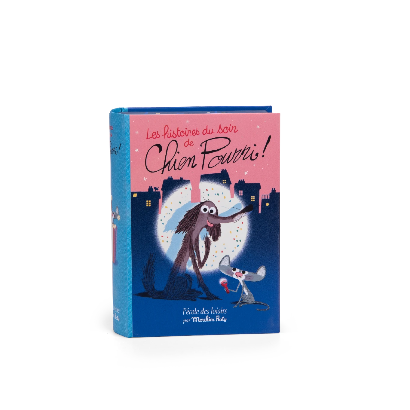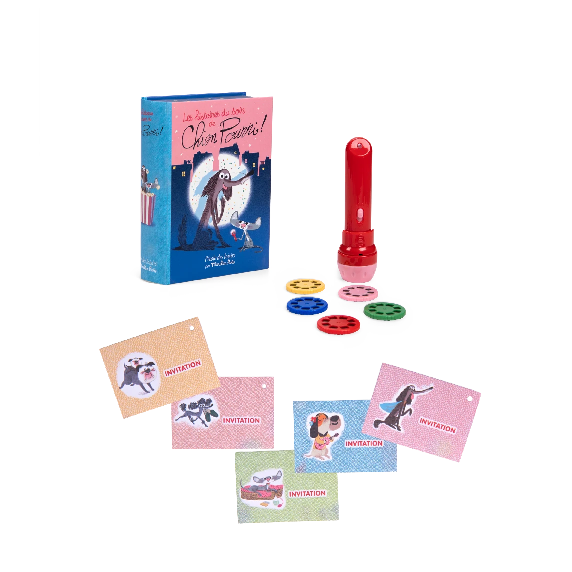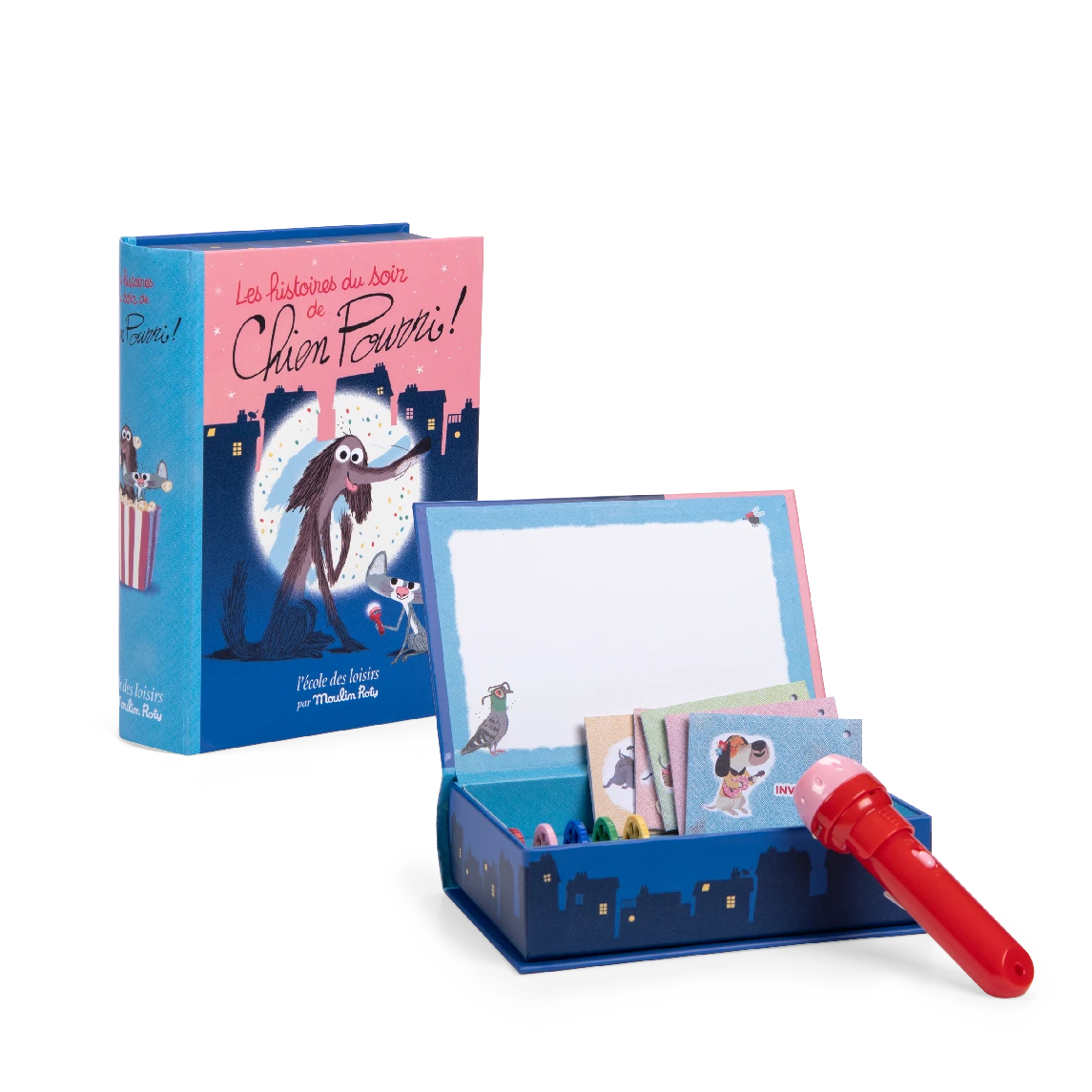 Coffret illustré, conçu comme un livre magique avec une lampe à projeter, 5 disques et 5 invitations. Chaque disque, projeté dans le livre ou sur un mur, raconte une histoire de Chien Pourri, grand farceur de l’école des loisirs.