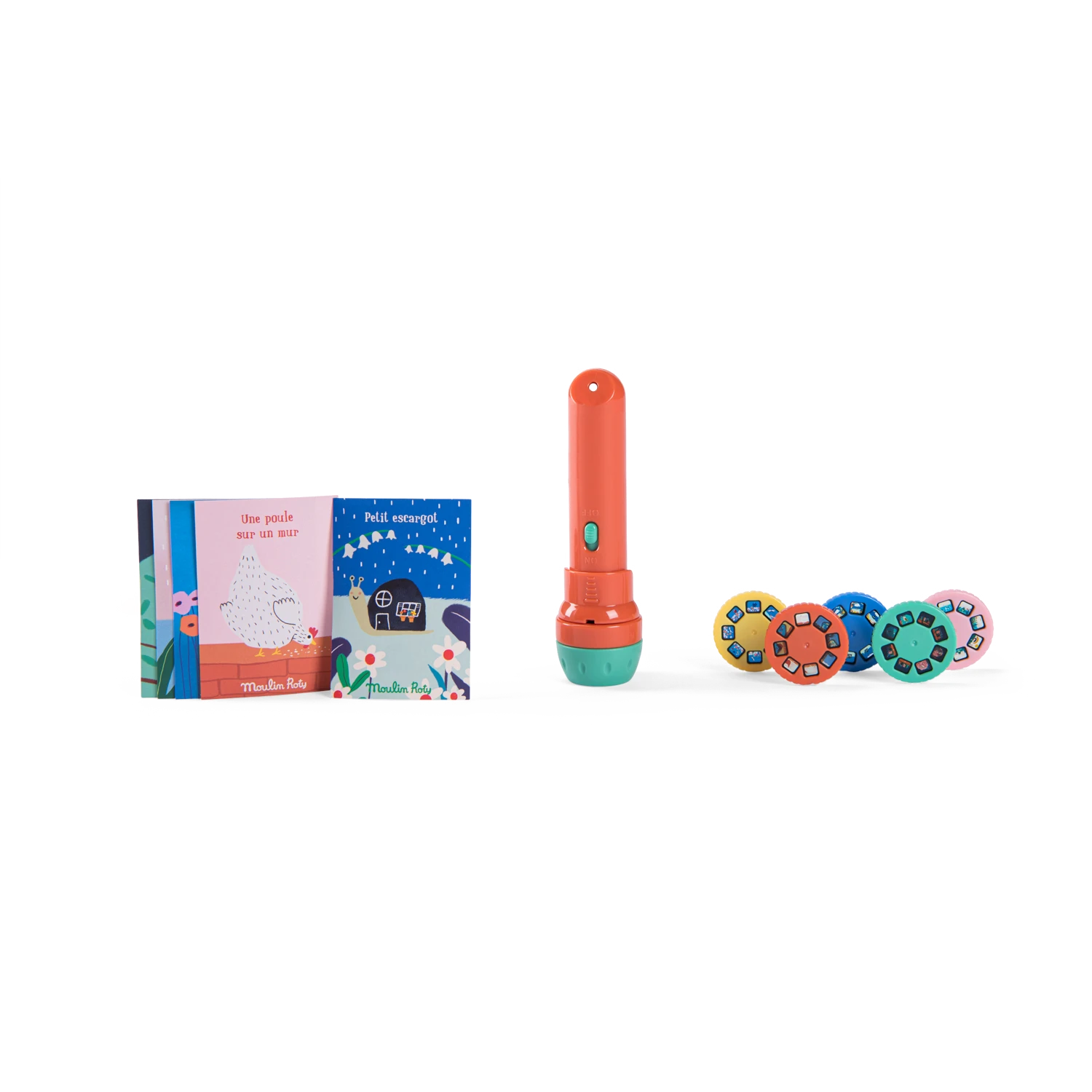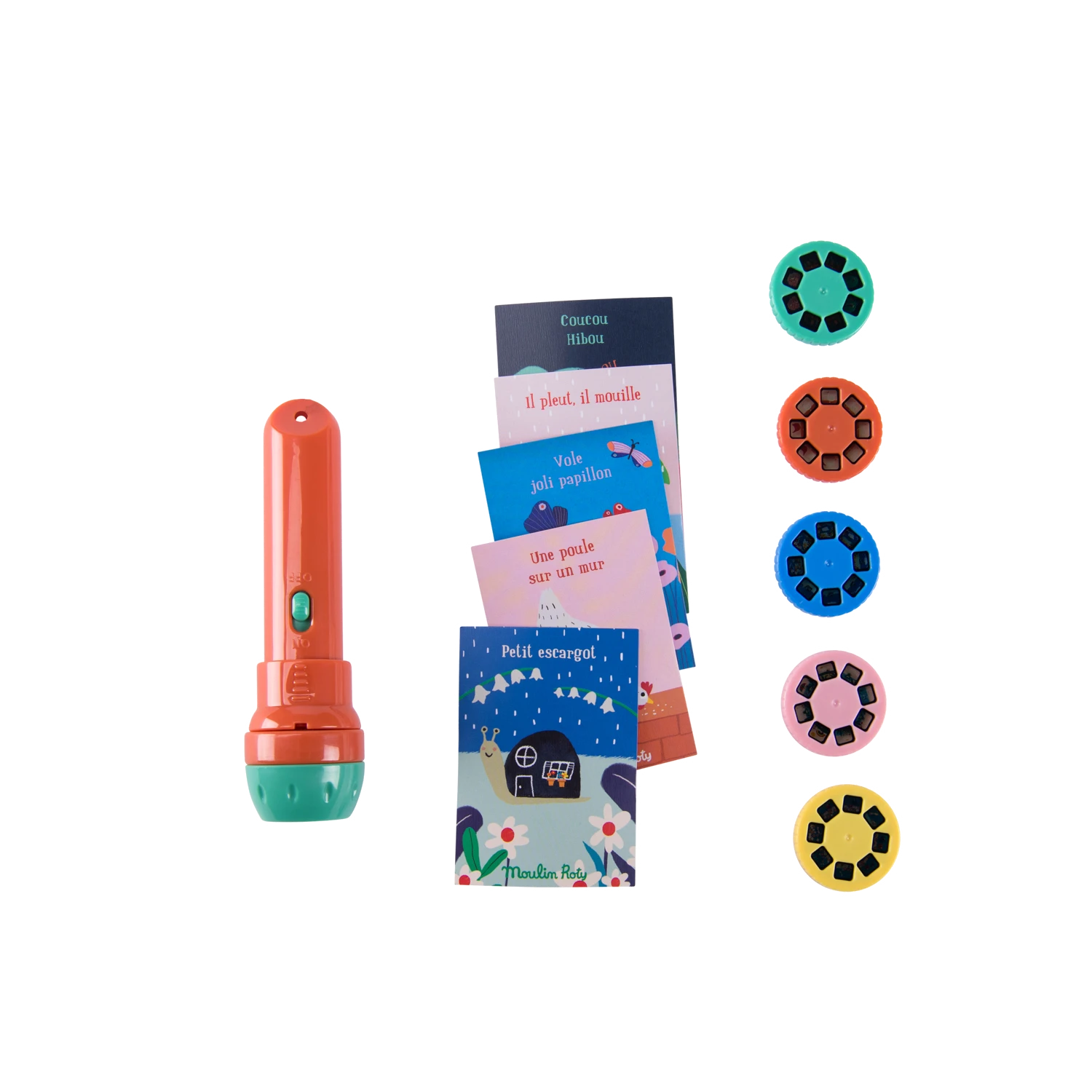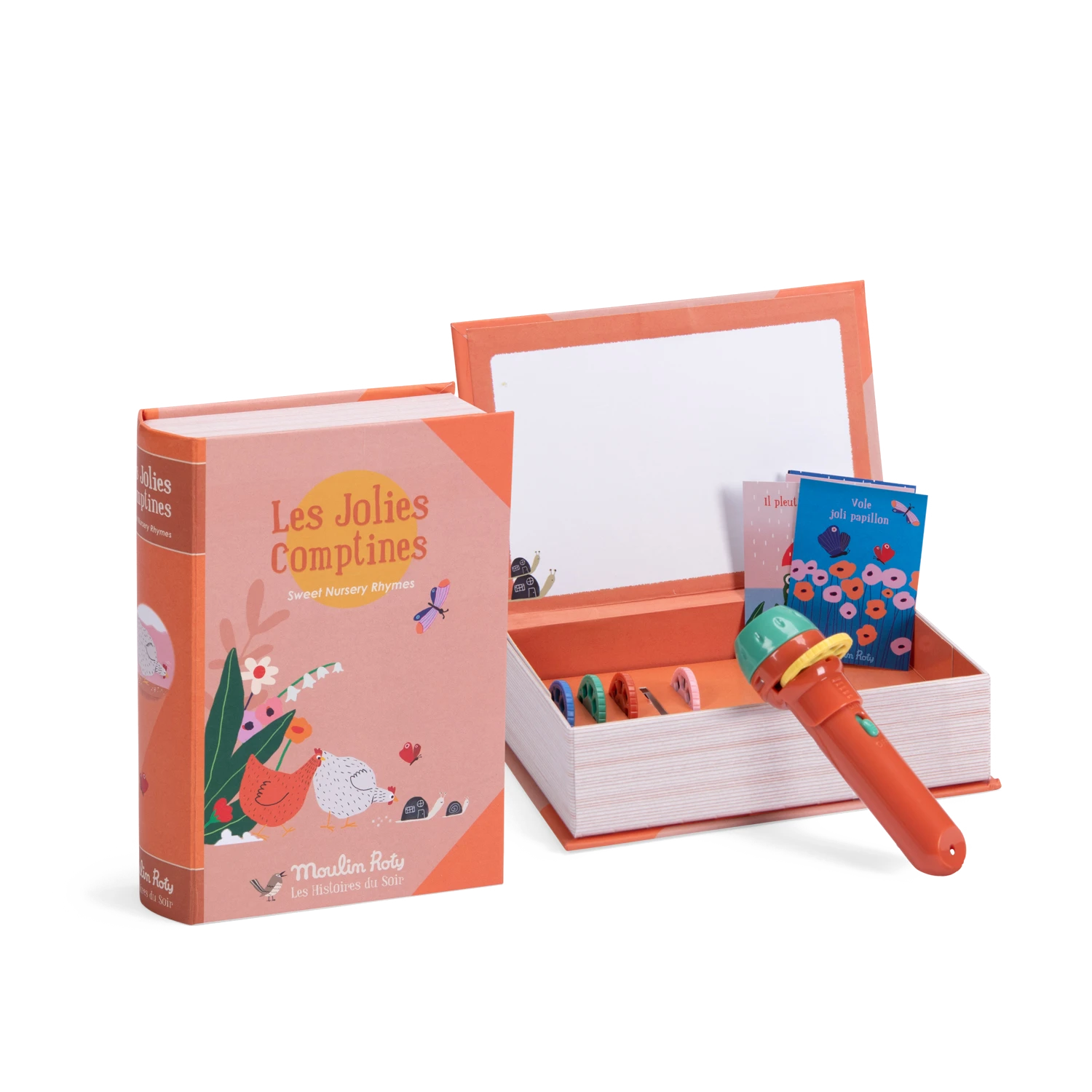 Coffret avec écran de projection, joliment illustré ! Conçu comme un livre, contient une lampe à projeter, 5 disques sur l’univers des comptines et 5 cartes pour chantonner. Développe l’imaginaire des petits et offre de précieux moments de complicité.