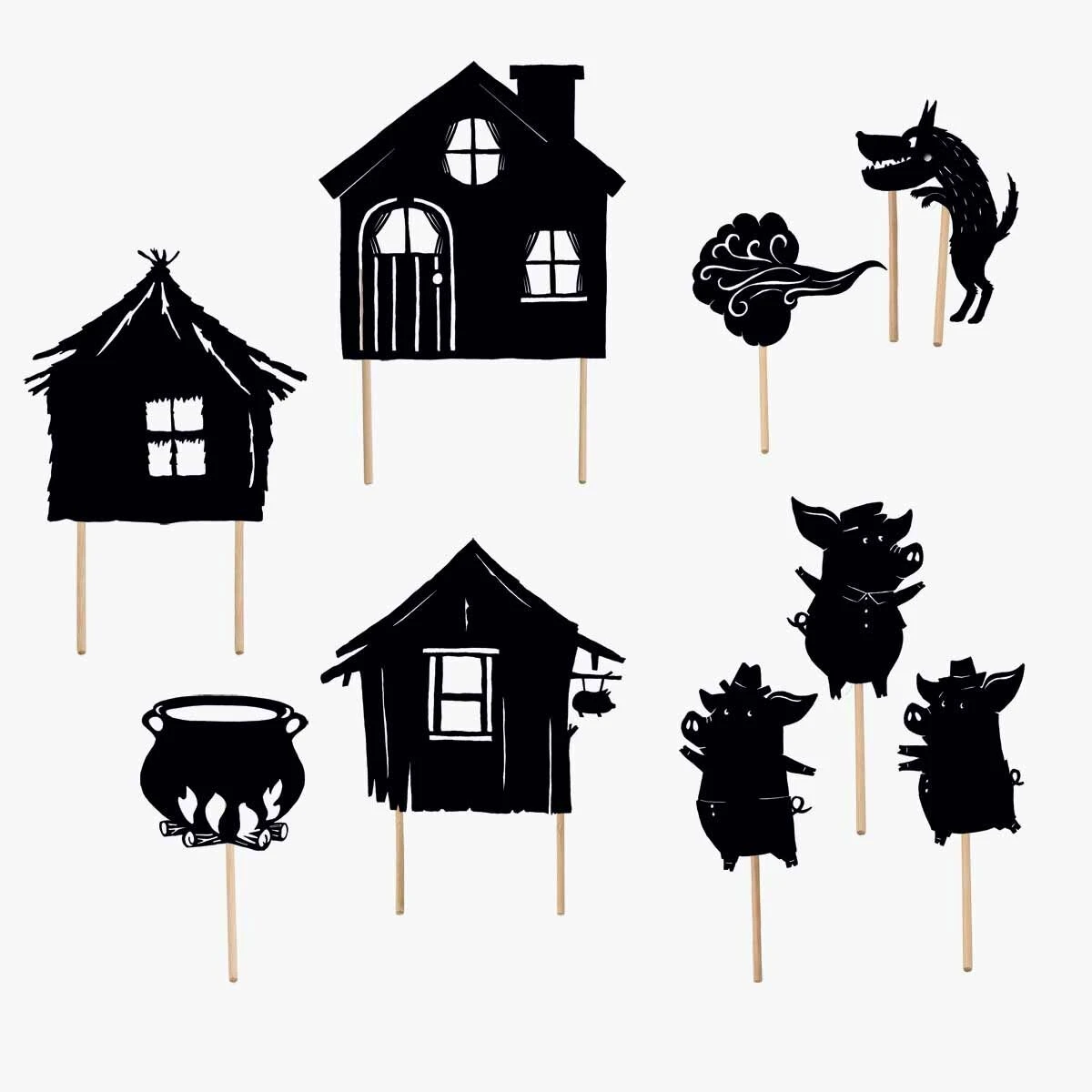Ombre découpées sur le conte des 3 Petits Cochons, à animer et projeter sur le mur, ou derrière un écran de spectacle, pour inventer de belles histoires quand vient le soir… Elles développeront l’imaginaire des enfants et seront sans cesse réinventées !