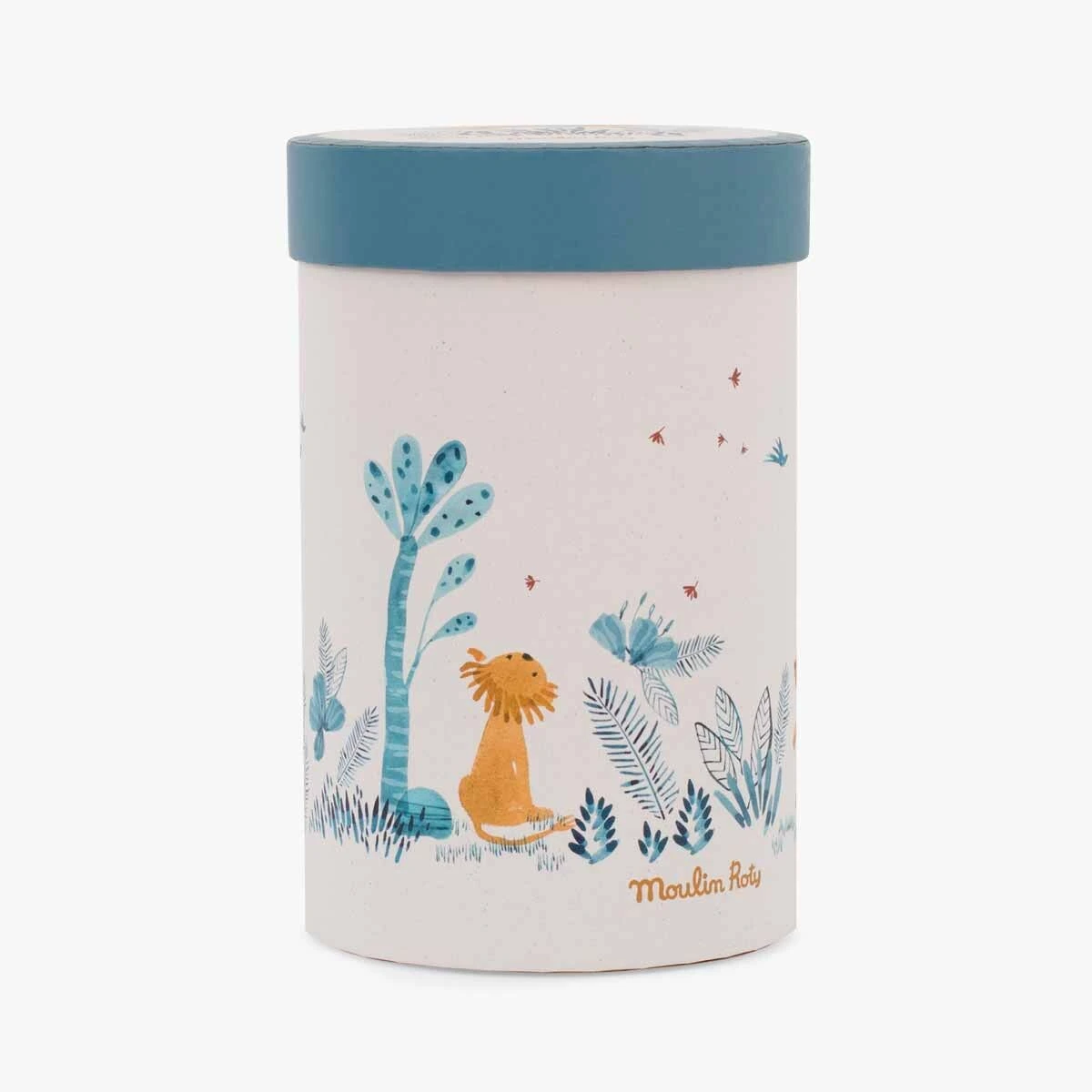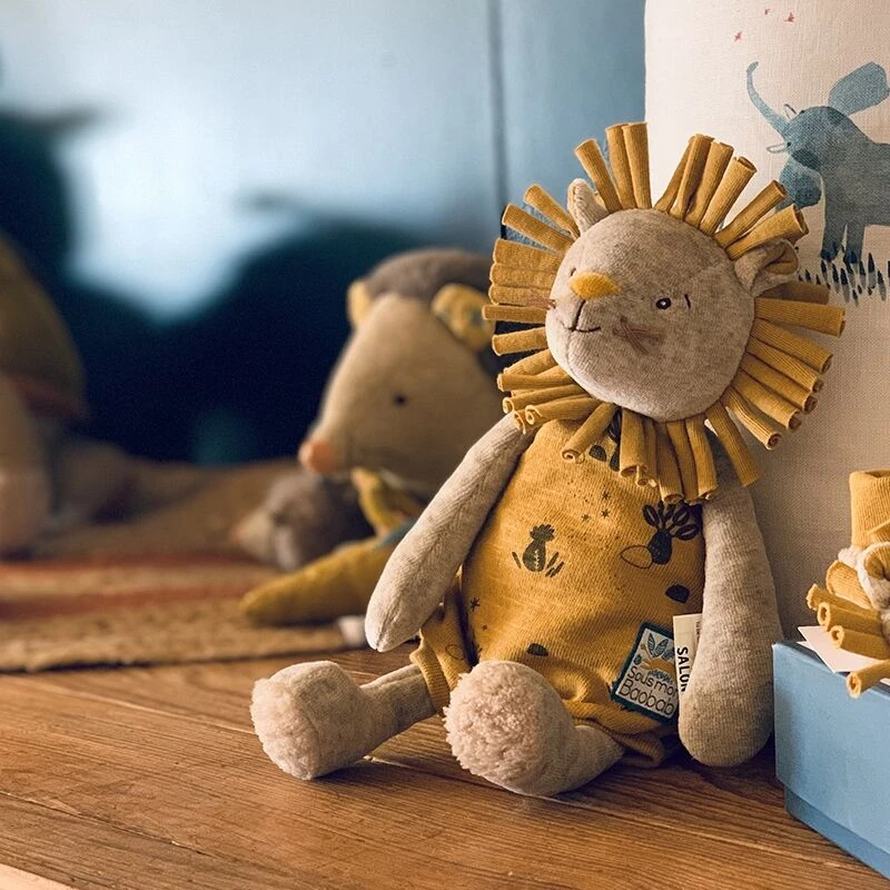 Paprika le lion nous offre un grand sourire et plein de curiosités au toucher : de longues pattes à attraper, une crinière et des moustaches à tortiller, et un corps moelleux pour se reposer… Il est installé dans une jolie boîte cadeau toute en rondeur.