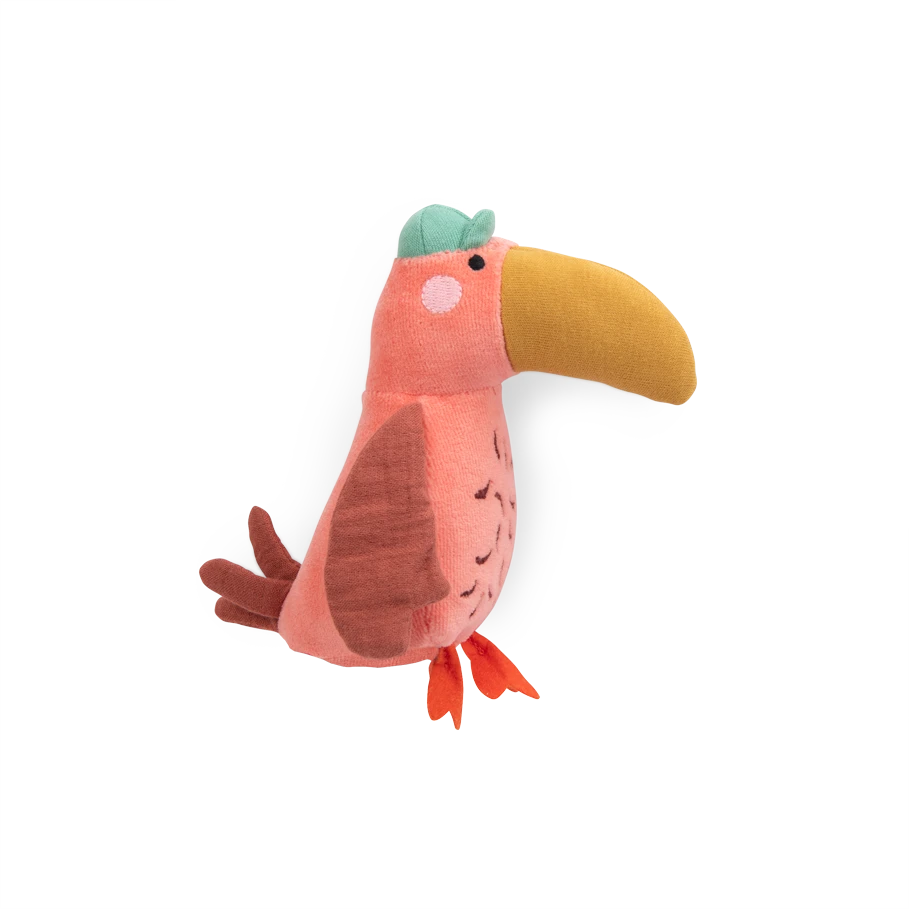 Petit toucan en velours tout doux à la belle couleur orangée. Casquette sur la tête et gros bec, il fera craquer à coup sûr bébé. Dans son ventre se cachent de petites billes qui font du bruit quand on l’agite.