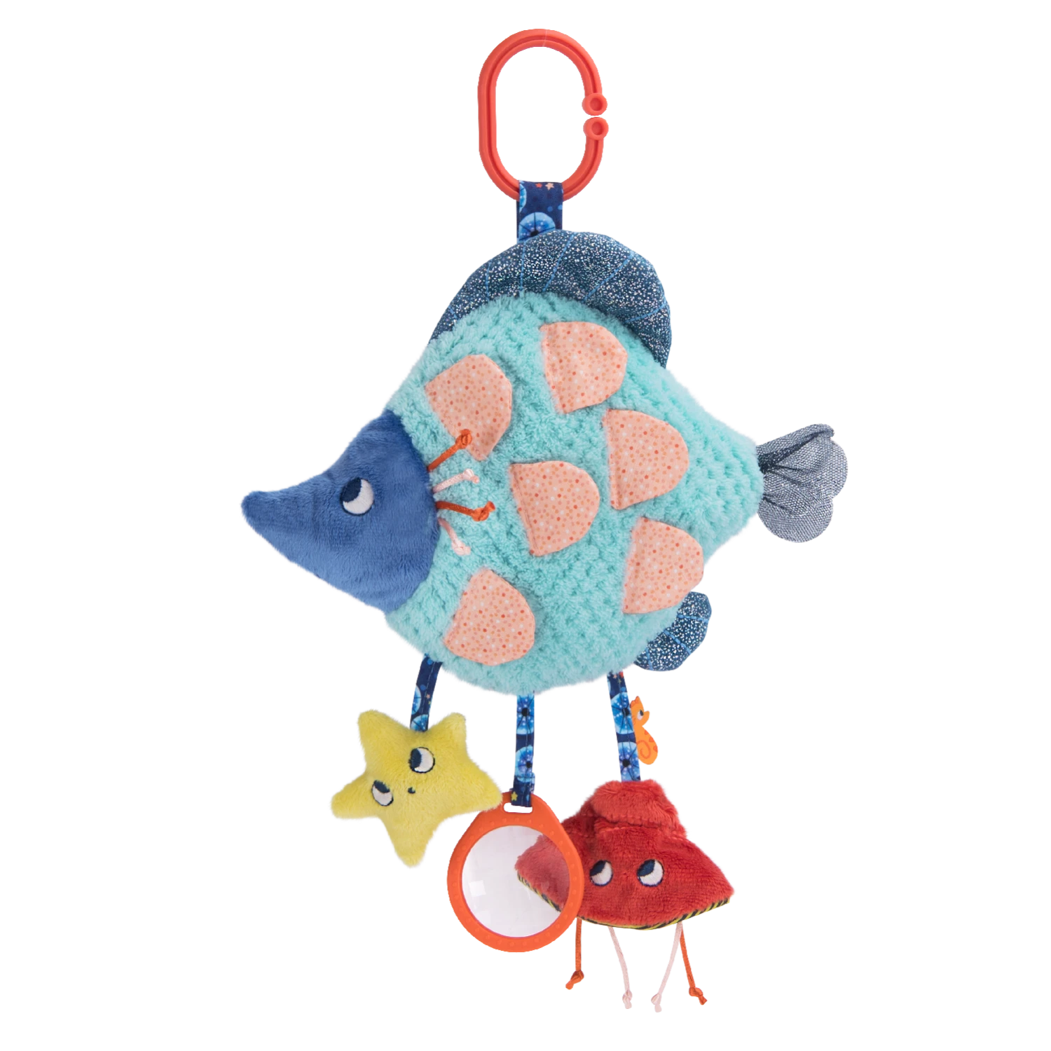 Au fond de la mer se trouve un poisson extraordinaire aux couleurs et textures étonnantes, rempli d’activités : grelot, papier crissant, étiquettes à explorer… De belles surprises pour bébé à découvrir du bout de ses petits doigts.