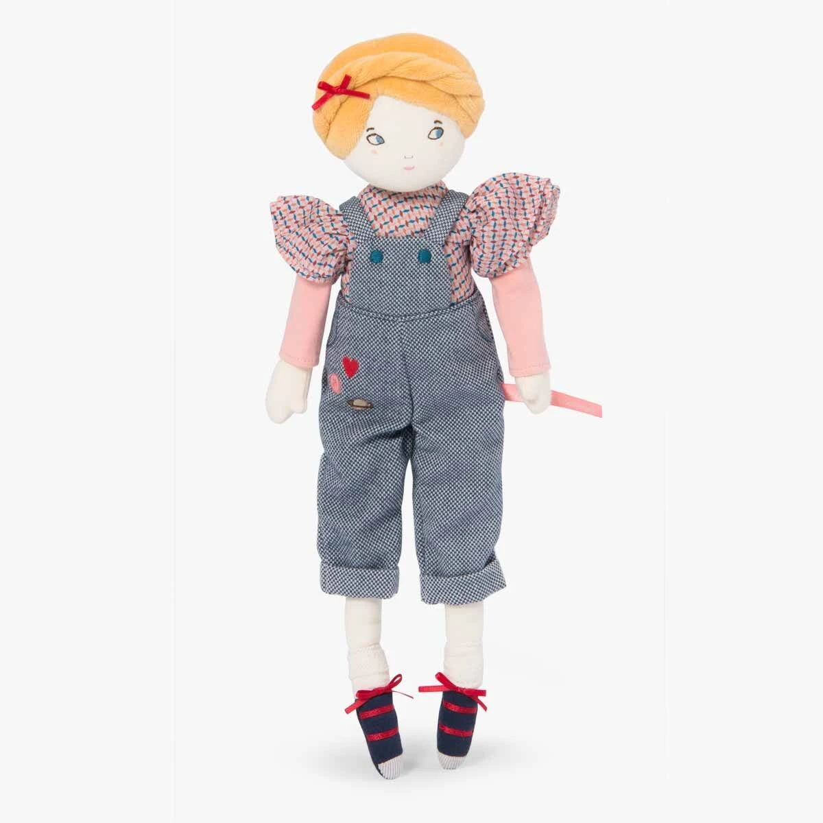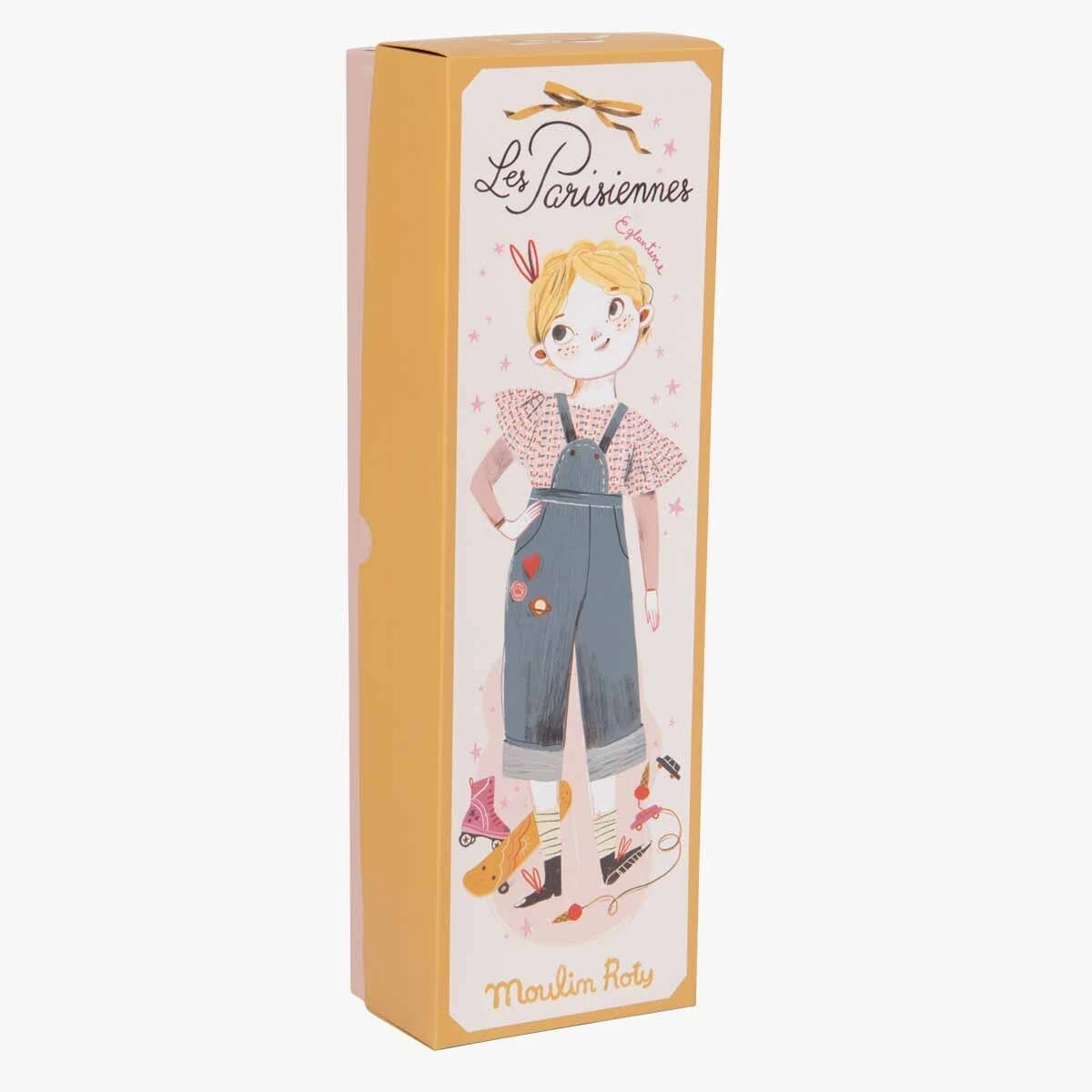 Intrépide poupée Eglantine ! A toute vitesse sur son vélo, manches bouffantes, salopette brodée, et tennis à lacet, elle dévale les rues coiffée de sa couronne de tresses. Elle se présente dans un coffret cadeau, illustré par la créatrice Lucille Michieli