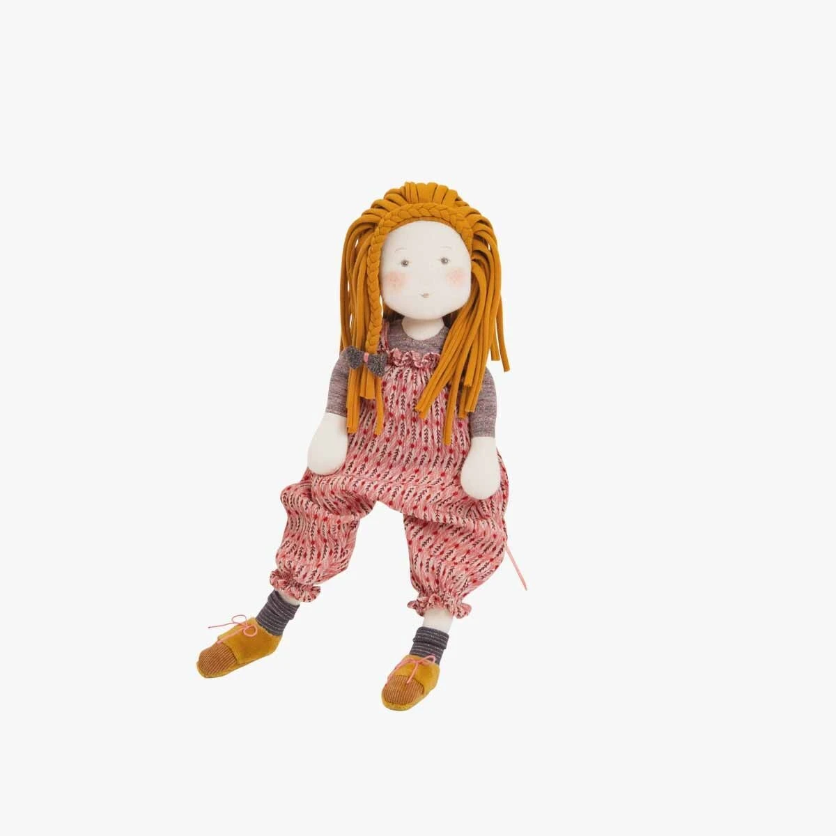 Poupée de chiffon Vanille, au doux visage illustré et imprimé, avec des cheveux blonds en jersey rouleauté surmontés d’une jolie tresse. Elle a enfilé ses chaussures à lacets roses, et sa salopette ample à motifs, parfait pour une balade de Printemps.