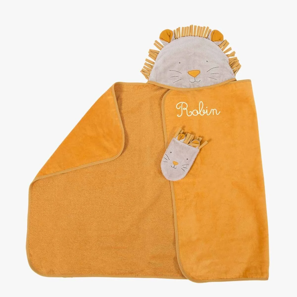 Cape de bain en éponge avec une capuche en tête de lion et sa drôle de crinière… que l’on retrouve aussi sur un petit gant brodé ! Idéale pour un cadeau de naissance, elle peut être brodée au prénom de l’enfant.