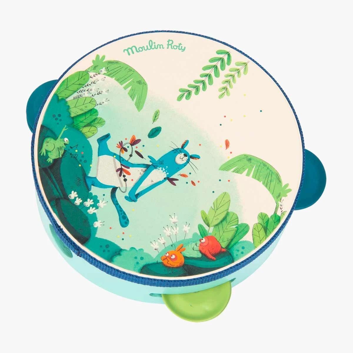 Tambourin en bois avec 4 cymbales, peint en vert d’eau avec ruban sur la tranche et illustrations de Zimba la panthère dansant au cœur de la jungle. Développe le rythme et l’éveil musical des tout-petits, facile à utiliser.