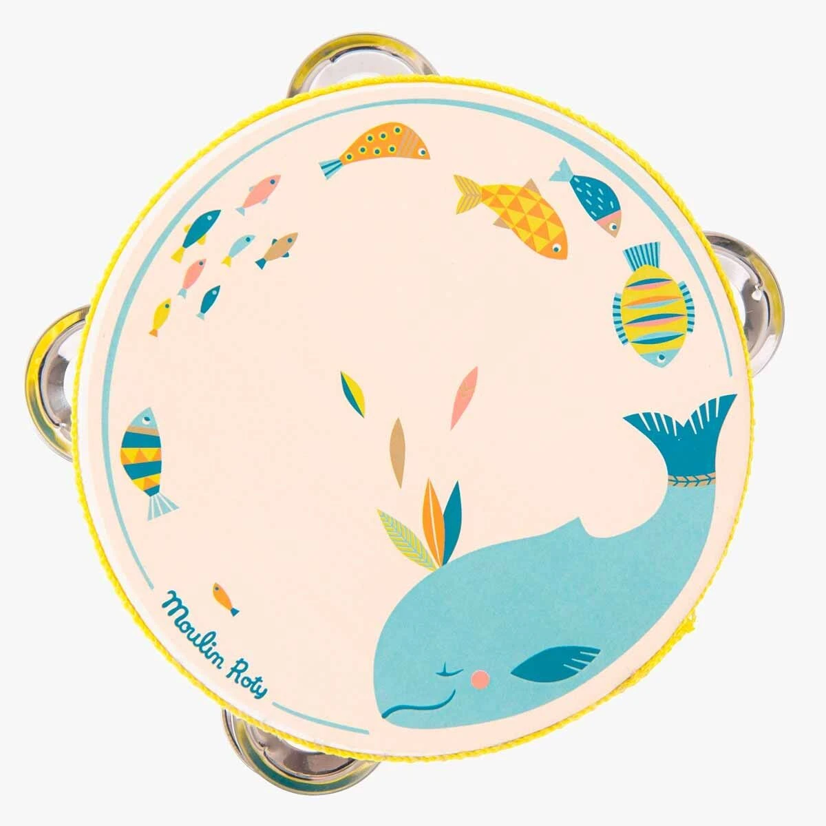 Tambourin 4 cymbales en bois crème avec ruban sur la tranche et illustrations folks et poétiques représentant la baleine de la gamme entourée, de ses petits poissons. Développe le rythme et l’éveil musical des tout-petits, facile à utiliser.