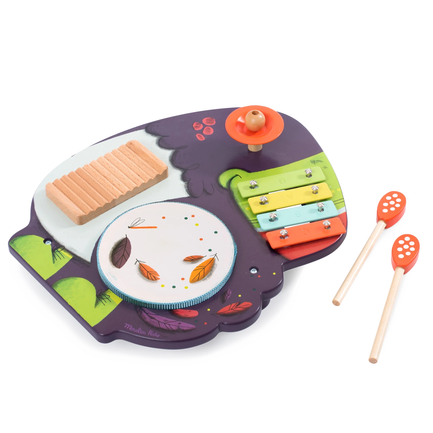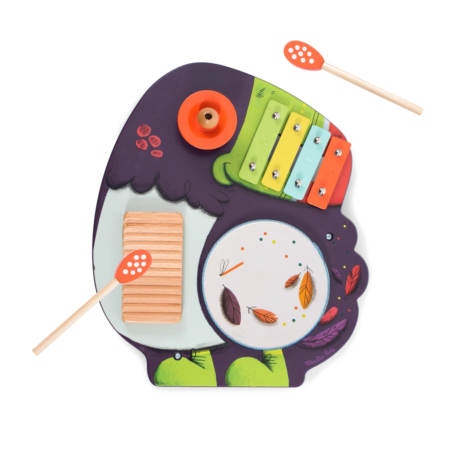 Pakou le toucan cache plein de surprises musicales ! Sous son œil rieur, les petits pourront jouer du tambour ou du métallophone, faire vibrer une cymbale ou s’amuser avec le grattoir, munis de 2 baguettes en bois !