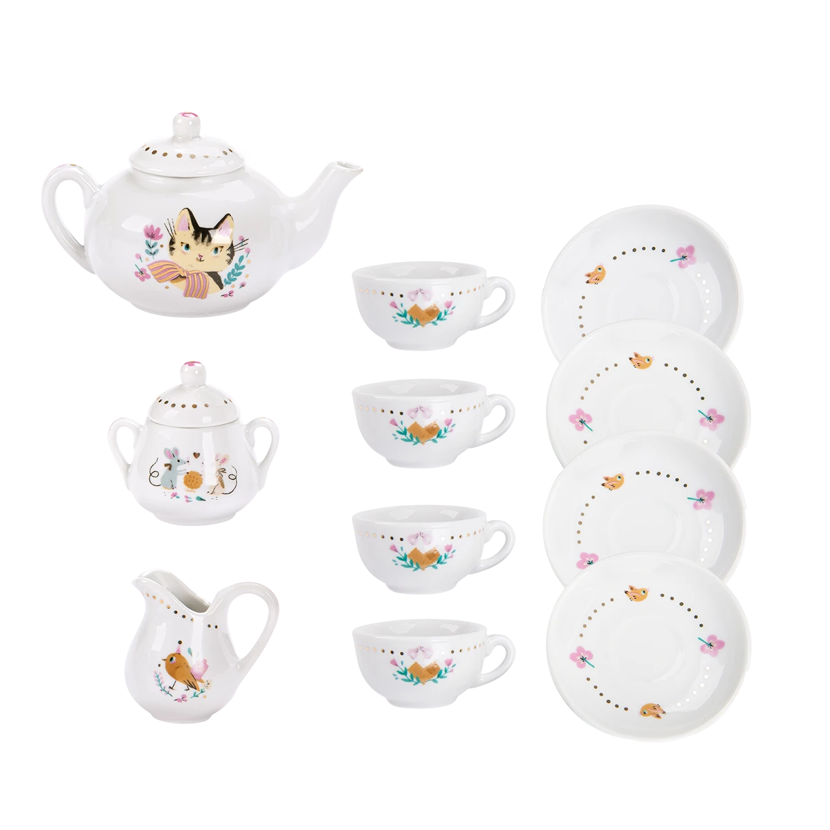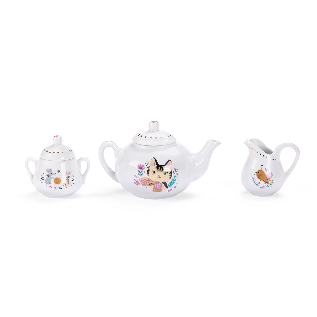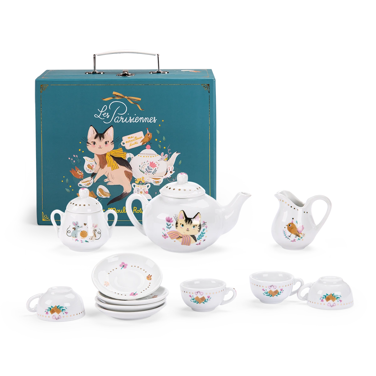 Service à thé en céramique orné de délicats motifs illustrés par Lucille Michieli. présenté dans un ravissant coffret pour servir le goûter à sa maman et ses amies les poupées. Comprend 1 théière. 4 tasses et 4 assiettes. 1 pot à lait et 1 sucrier.